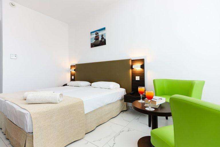Szobák: minden standard szoba praktikusan berendezett, egy hálószobás (~22 m2), fürdőszobás, légkondicionálóval, hajszárítóval, síkképernyős tv-vel, vízforralóval, széffel, minihűtővel és telefonnal felszerelt. A szuperior szoba (~24 m2) extra kényelmet nyújt, modern dizájnnal és felszereltséggel és a szobában egy kis ülősarok (dohányzóasztal, székek) is található. A szuperior családi szoba hasonló felszereltségű, nagyobb alapterületű (~30 m2), a szobákban két ágy és pótágyként dívány (vagy normál ágy) található. A deluxe szobák (~24 m2) a szálloda legszebb szobái, ezek a szobák extra kényelmi funkciókkal vannak felszerelve, mint például egy 43 hüvelykes Smart TV, eszpresszó gép (napi kapszulafeltöltéssel), fürdőköpeny és szobapapucs. Ha magasabb szintű kényelmet keres, a deluxe szoba ideális választást jelent. Minden szobához erkély vagy terasz tartozik, szárazföldi, medencére vagy tengerre néző kilátással (különböző irányú rálátással).