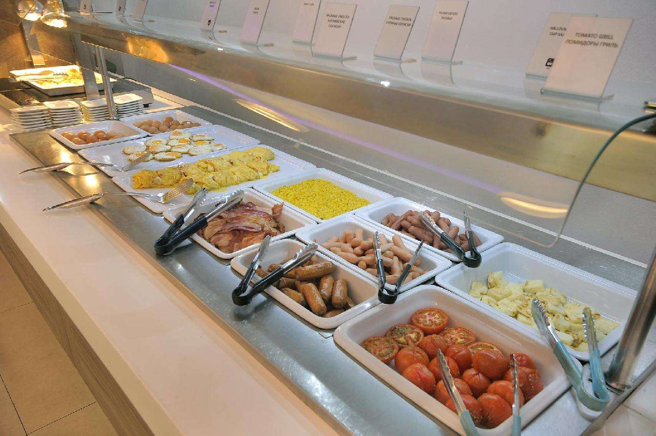 reggeli amely tartalmaz: meleg ételeket (rántotta, omlett, kolbász, sült zöldségek), hideg ételeket, friss pékárut, gyümölcsöket, zöldségeket, tejtermékeket, gabonaféléket, lekvárokat, mézet, gyümölcsleveket, kávét és teát. A