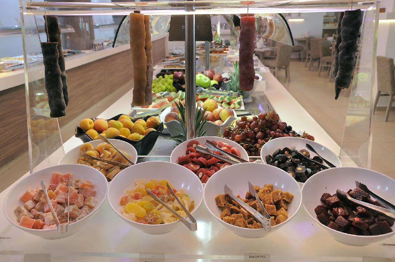 félpanzió büfé vacsorát is tartalmaz nemzetközi és mediterrán fogások széles választékával: grill ételek, friss saláták, húsok, tészták, vegetáriánus opciók, tematikus estekkel pl: ciprusi, mediterrán, ázsiai, olasz, grill estek. Felár ellenében