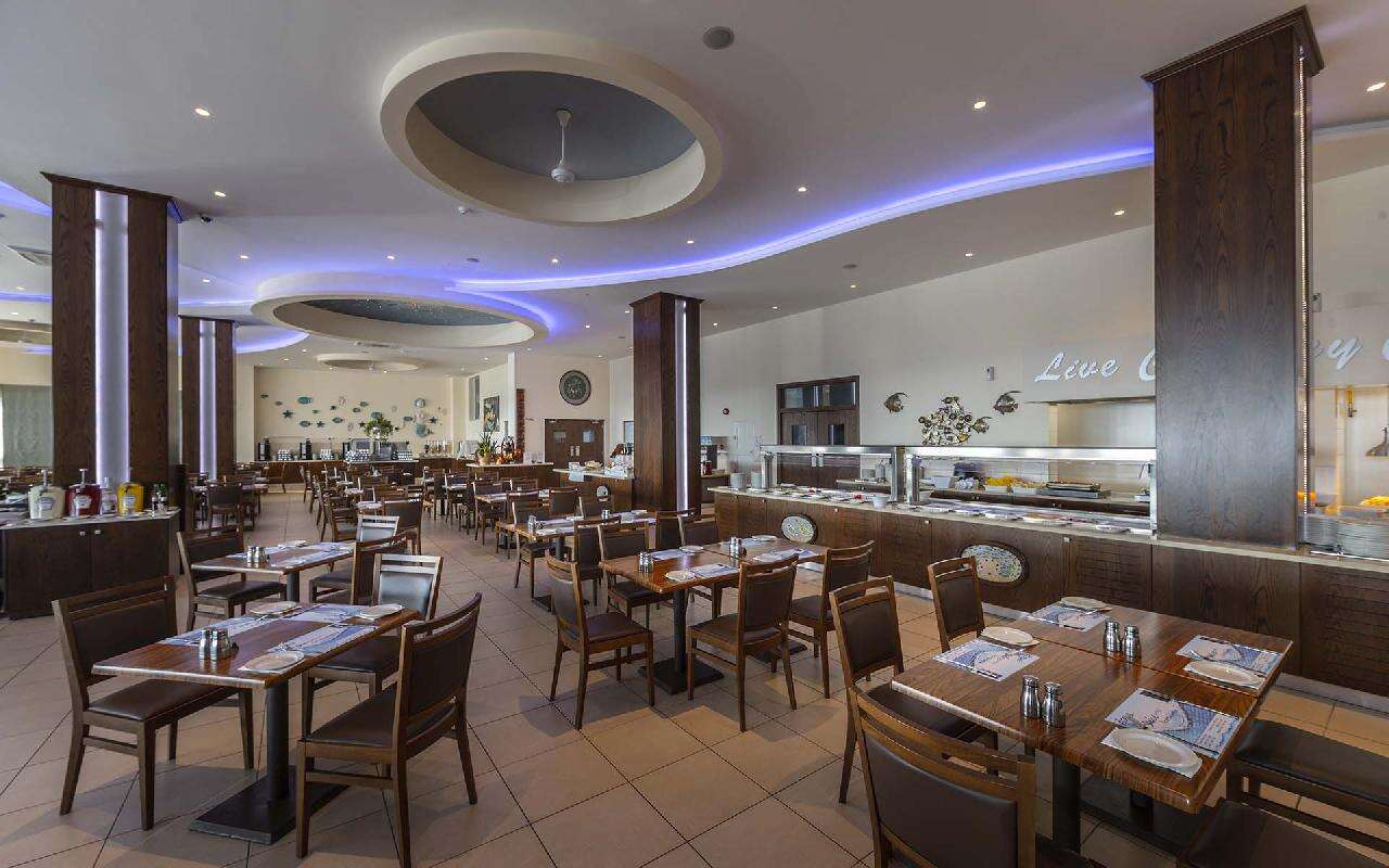 Étkezés: all inclusive ellátás, benne: büfé reggeli (07:30-10:00), ebéd (12:30-14:30) és vacsora (19:00-21:30), snack ételek és szendvicsek (11:00-12:30 és 15:00-18:00 óra között), jégkrémek, korlátlan italfogyasztás 10:00–23:30 óra között. Az italválaszték pohárban felszolgálva, a szálloda által meghatározott helyi és alkoholos és üdítőitalokra, vízre és gépi kávéra vonatkozik. Az import és palackozott italok fogyasztása térítéshez kötött. Minden este választékos tematikus büfé vacsorákkal (olasz, ciprusi, ázsiai, mexikói stb.).