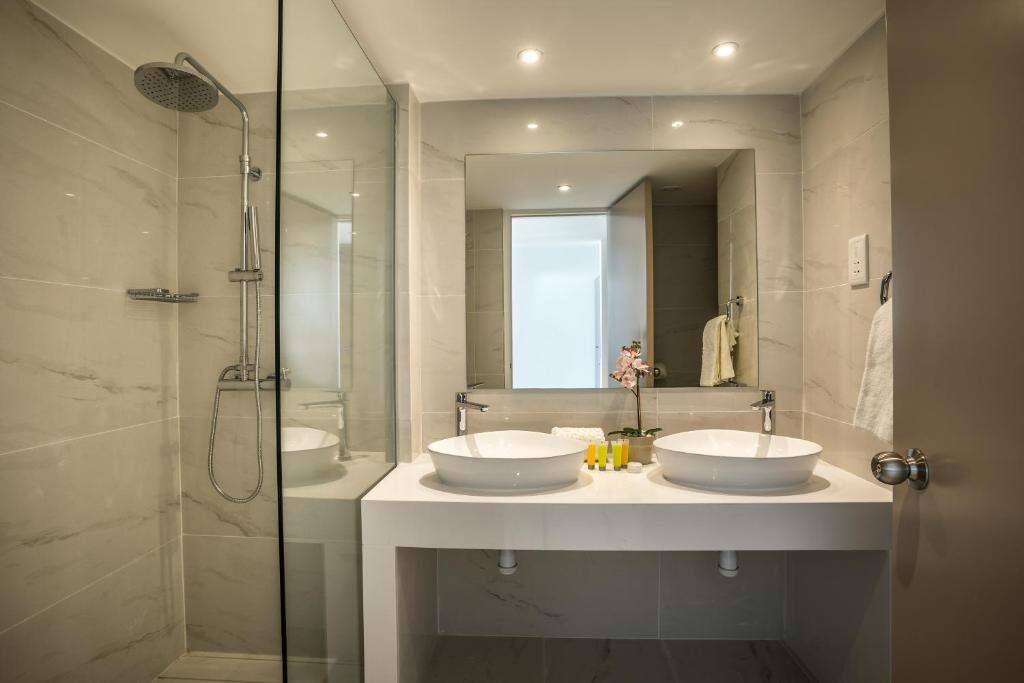 Szobák: minden szoba egyhálószobás (~22m2), praktikusan berendezett, fürdőszobás, légkondicionálóval, síkképernyős tv-vel, hajszárítóval és telefonnal felszerelt. Széf és hűtő, térítés ellenében bérelhető. A szobákhoz erkély tartozik szárazföldi, oldal tengerre néző vagy tengerre néző kilátással.