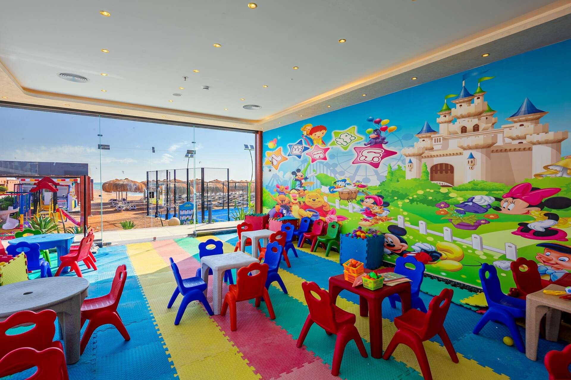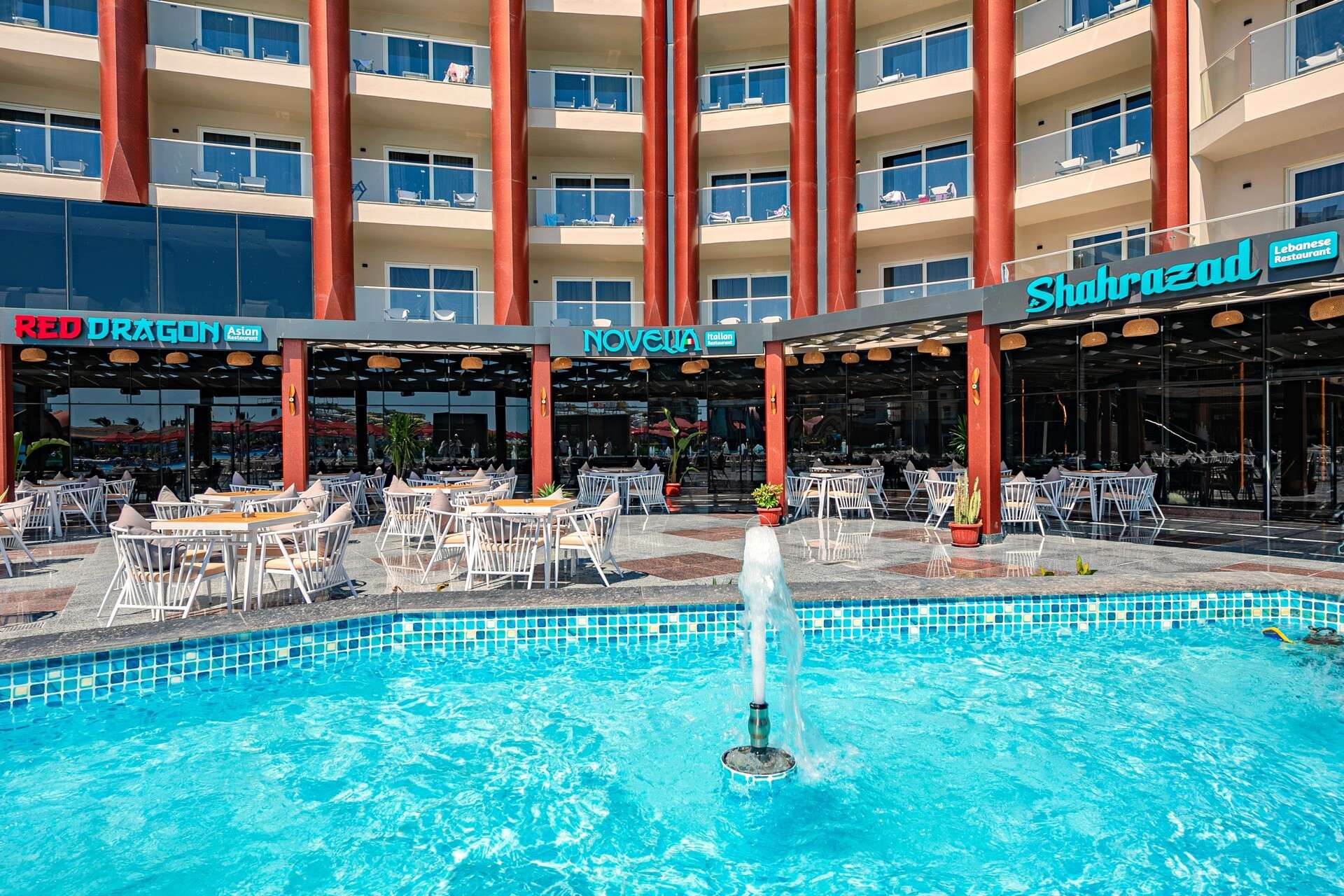 All Inclusive: minden étkezés büférendszerben, késői vacsora, a'la carte-étterem (libanoni, olasz, ázsiai, mexikói, indiai ingyenes, előzetes foglalás szükséges), napközben könnyű snack-ételek, kávé, tea és sütemények, helyi alkoholos és alkoholmentes italok egész nap.