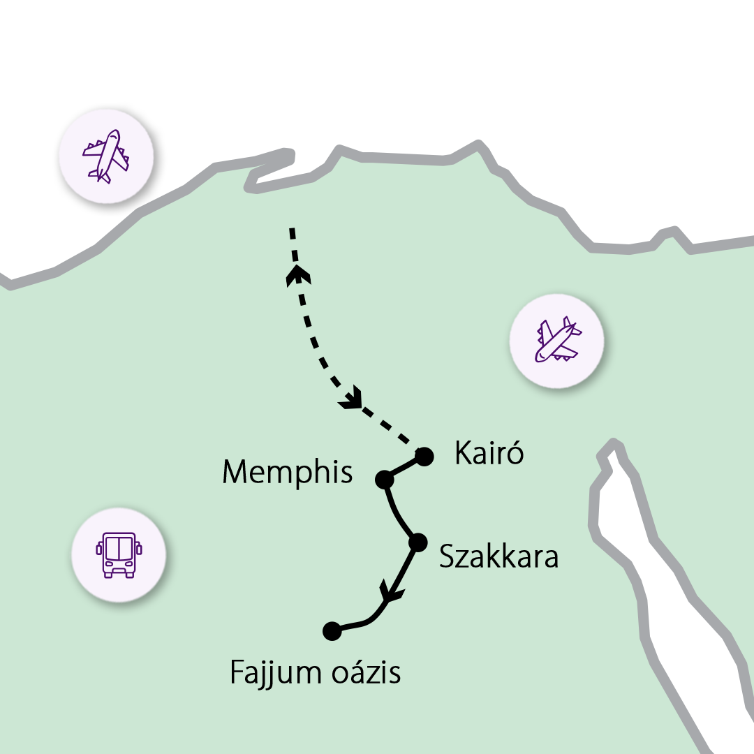 1. NAP BUDAPEST – KAIRO A menetrend függvényében, tervezetten délután, találkozás képviselőnkkel a Liszt Ferenc Repülőtéren. A csoport önállóan repül Kairóba közvetlen járattal, ahol a reptéren már várni fogja őket magyar nyelvű idegenvezetőnk. Az esti érkezés után transzfer a hotelbe, ahol elfoglaljuk a szállásunkat és vacsorával zárjuk a napot. 2. NAP PIRAMISOK – MEMPHIS – SZAKKARA A mai napon a gízai piramisokhoz látogatunk el, ahol megcsodálhatjuk Kheopsz, Khephrén és Mükerinosz fáraók grandiózus építményeit, melyek az Óbirodalom idején, körülbelül 5.000 évvel ezelőtt készültek. A Kheopsz-piramis, a legnagyobb és legrégebbi, az ókori világ hét csodájának egyetlen fennmaradt alkotása. Természetesen meglátogatjuk a híres Szfinxet is, amely a piramisok őrzőjeként emelkedik ki a sivatag homokjából. Ezután ellátogatunk a Memphis-Szakkara régióba, ahol az ókori főváros, Memphis legrégebbi temetkezési helye található. Itt áll Dzsószer fáraó lépcsős piramisa, a régió egyik legismertebb síremléke. Az út során lesz lehetőség vásárlásra egy parfümüzletben. A nap végén Kairóba visszatérve elfogyasztjuk vacsoránkat a szálláson. 3. NAP KAIRO – FAJJUM OÁZIS Reggeli után autóbuszunkkal és idegenvezetőnkkel a sivatag egy másik arcának felfedezésére indulunk. Először a Fajjum oázisba megyünk. Csodálatos látvány, ahogy a szaharai homokból egy ilyen csodás zöld terület nő ki. Itt található Egyiptom legnagyobb kiterjedésű sós tava is a Qaroun-tó, amely híres hatalmas madárpopulációjáról. Teszünk egy sétát az oázisban, majd, aki szeretne kávézhat is egyet. Majd tovább indulunk a József tavakhoz. Mintha egy tündérmese tárulna elénk. A sivatag közepén találjuk a Wadi el Rayan vízesést, melyekről csodás képeket készíthetünk. Vacsorára érünk vissza a hotelbe. 4. NAP KAIRO A mai napon is izgalmas programok sora vár ránk. Elsőként a Nagy Egyiptomi Múzeumot keressük fel, amely a világ leggazdagabb egyiptológiai gyűjteményével büszkélkedhet. A múzeumlátogatást követően Kairó óvárosába vezet utunk, ahol megtekintjük a Salah El Din citadellát és a lenyűgöző Mohamed Ali mecsetet. Szabadidőben lehetőségünk nyílik a híres Khan el-Khalili bazárban szuveníreket vásárolni és elmerülni a helyi piac nyüzsgő forgatagában. Délután Kairó óvárosának keresztény emlékeit fedezzük fel, köztük a Függőtemplomot, a Ben Ezra zsinagógát, az Abu Szerga templomot és a Szent Barbara-templomot. A programunk végén visszatérünk a hotelbe vacsorázni és kipihenni magunkat a hazaútra. 5. NAP KAIRO – BUDAPEST Reggeli után transzfer a reptérre, ahonnan délelőtt közvetlen járattal Budapestre utazunk.