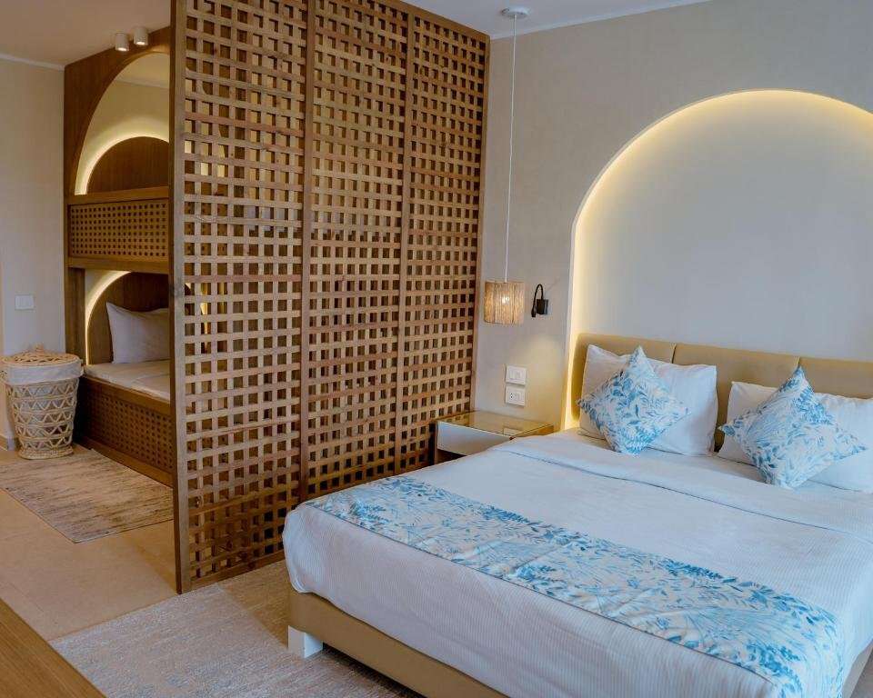 Családosok számára: A "The Beach Resort" területén található Superior kétágyas tengerre néző szoba (DSS) 24-43 m² a zöld tájra és a Vörös-tengerre nyújtanak gyönyörű kilátást. Élvezze a nagy king-size ágyat vagy két külön ágyat, saját erkélyt és lenyűgöző tengerre néző panorámát. A szobák felszereltsége: minibár, tea- és kávéfőzési lehetőség, TV, széf, telefon, terasz, fürdő zuhanyzóval, hajszárító, légkondicionálás, gyors internet (felár ellenében. A Családi szobák (FZ) 43 m² legfeljebb 4 fő számára, mind az alsó szinten találhatóak, és a teraszról gyönyörű kertre néző kilátással rendelkeznek. Két king-size ágy vagy egy king-size és egy külön ágy, valamint egy további kanapé található bennük, amelyen az összes családtag kényelmesen elfér. A felszereltség tartalmazza: minibár, tea- és kávéfőzési lehetőség, TV, széf, telefon, terasz, fürdő zuhanyzóval, hajszárító, légkondicionálás, gyors internet (felár ellenében). Ezen kívül vannak Deluxe családi szobák (FXD), amelyek kertre néznek, 43 m² 1 King Size ágy + emeletes ágy fa válaszfallal .