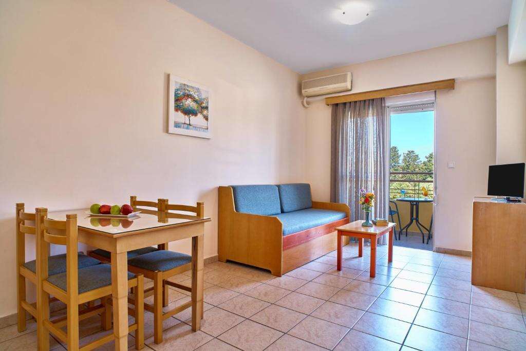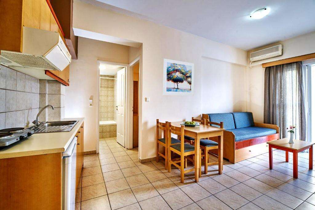 A szállás több épületblokkból álló, rendezett, mediterrán kerttel körbevett apartmanház, amely kb. 300–400 méterre található a legközelebbi homokos strandtól. A környéken tavernák, kávézók, boltok, autó- és motorkölcsönző, valamint buszmegálló található (kb. 150 m), ahonnan Chania központja könnyen elérhető.