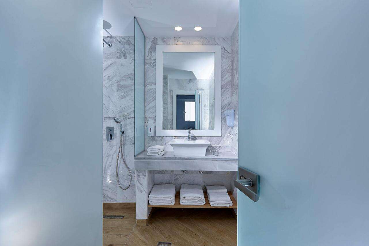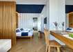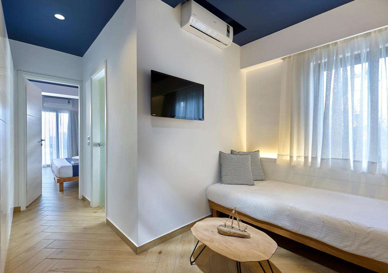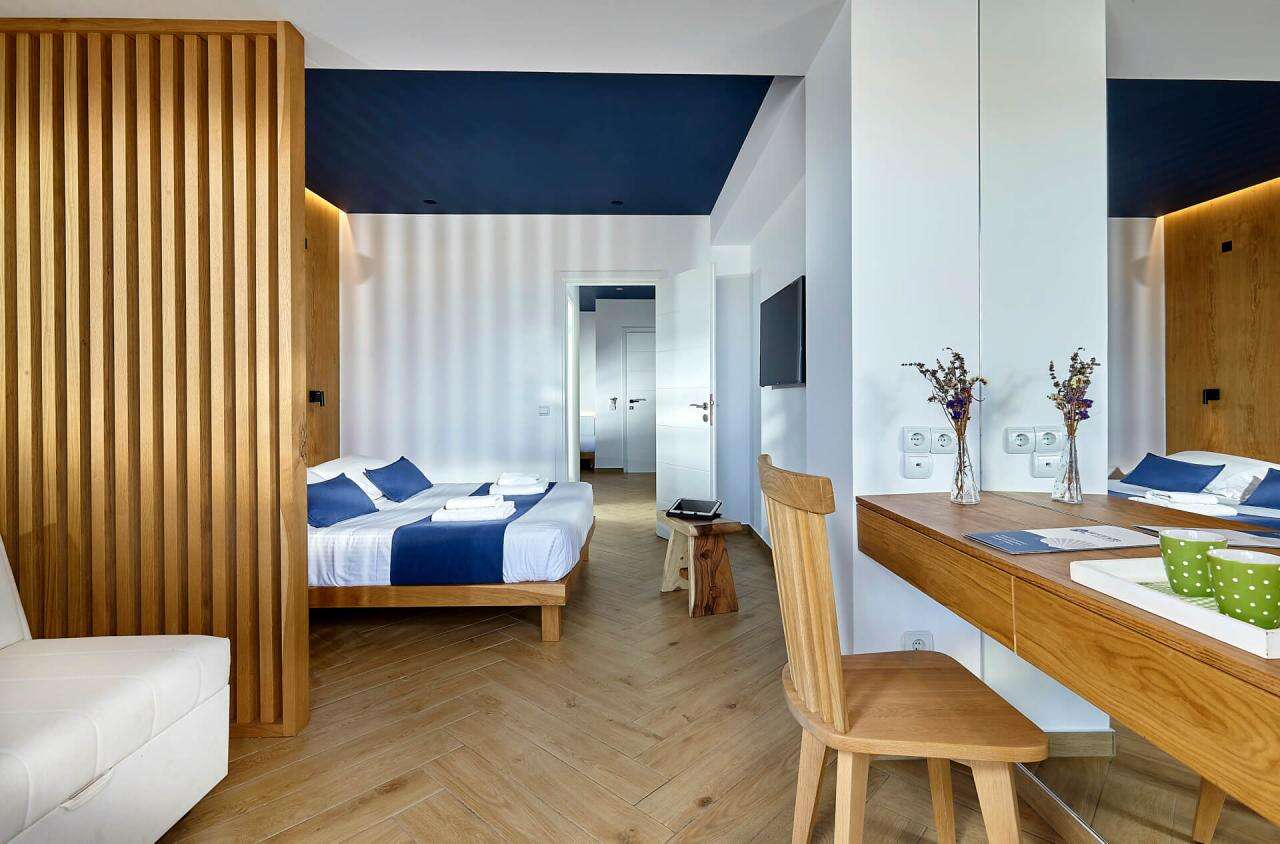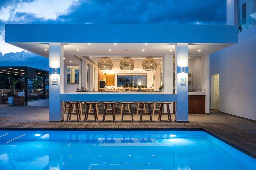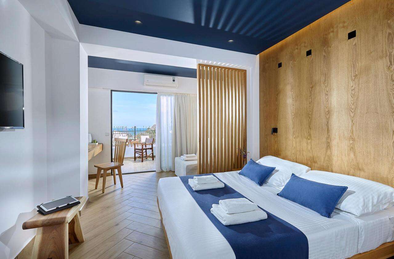 A padlótól a mennyezetig érő ablakokkal rendelkező, légkondicionált szobák mindegyike erkéllyel rendelkezik, ahonnan kilátás nyílik a medencére, a kertre vagy a Krétai-tengerre. A szobákban műholdas TV, széf és hűtőszekrény található. Minden saját fürdőszobában hajszárító áll rendelkezésre.