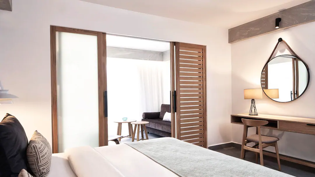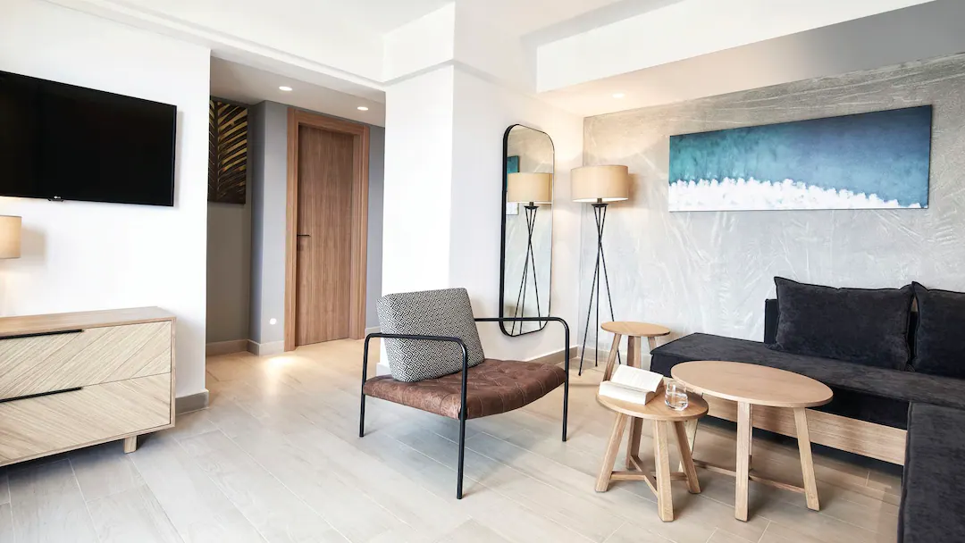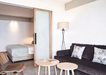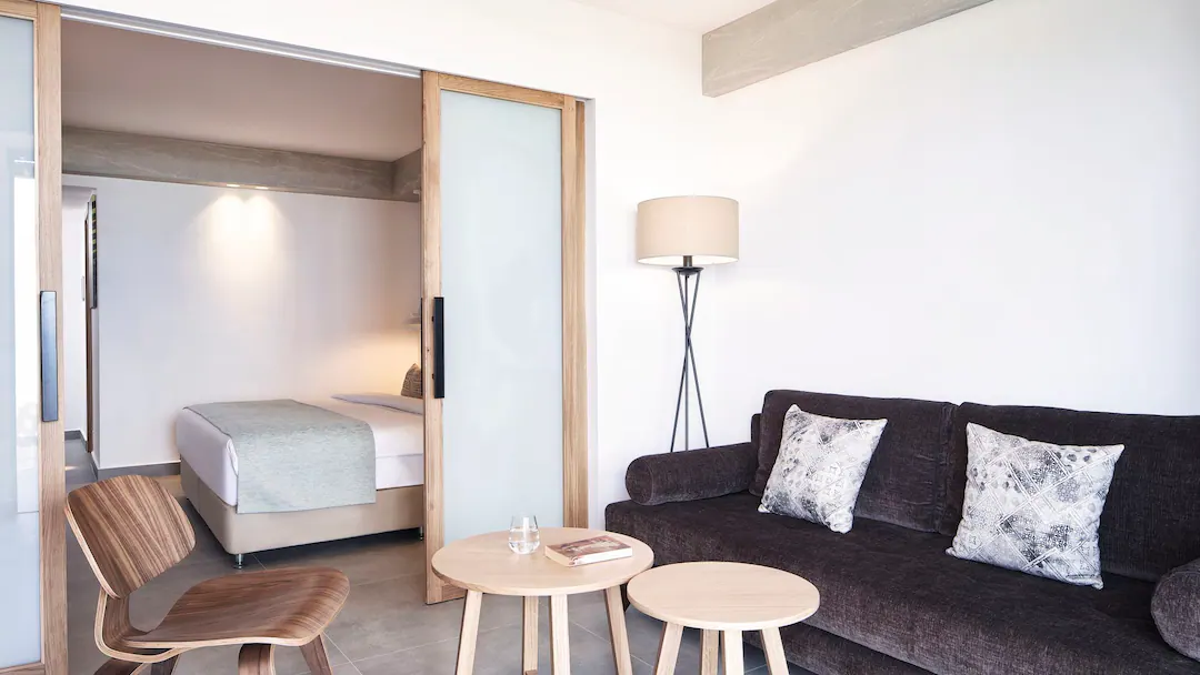 Családi lakosztály: a 47 m²-es családi lakosztály szintén nagyobb családok számára ideális, külön hálószobával és tágas nappali résszel. A berendezés modern és kényelmes, a családi együttlétre és pihenésre egyaránt alkalmas.