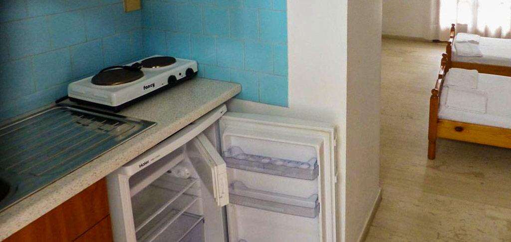 Szobák: Minden stúdió (1-2 fős) egyhálószobás, praktikusan, fabútorokkal berendezett, fürdőszoba tusolóval, kis konyharésszel (főzőlap, mosogató, edények) és hűtővel felszerelt. A szobához erkély vagy terasz tartozik, kertre vagy utcára néző kilátással. Felár ellenében légkondicionálás és széf a helyszínen igényelhető.