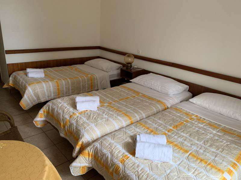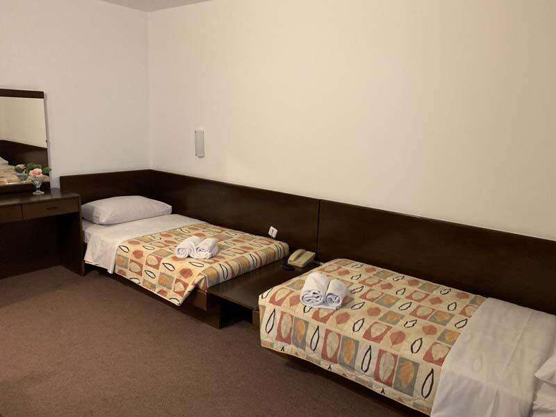 Szobák Hotel Adriatic: 2-3 ágy, fürdőszoba, telefon, ventilátor, tenger felőli szobák erkély nélküliek, a többi mely parkra vagy parkolóra néz erkélyes. A 3 ágyas szobák erkély nélküliek. A Hotel Adriaticban nincs lift.