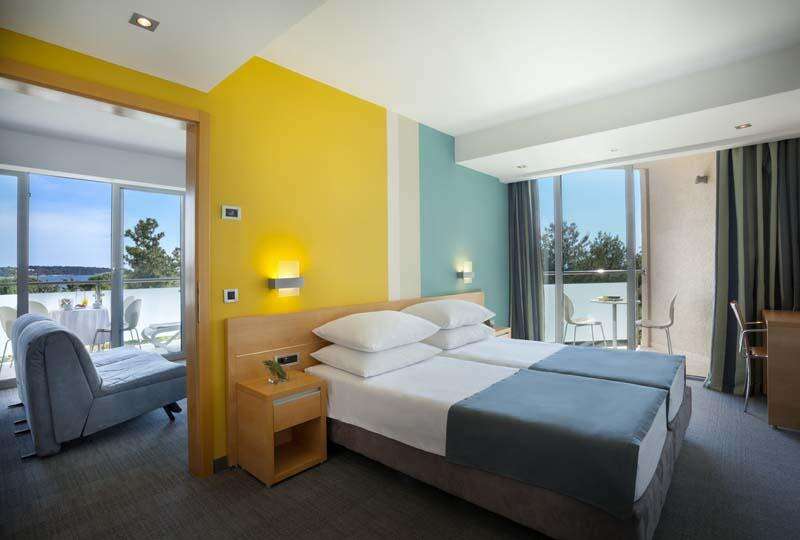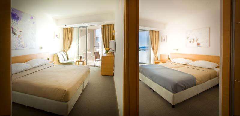 Suite 2+2: 2 ágyas hálószoba, nappali kihúzható kanapéággyal, tenger felőli erkély (max 2 felnőtt + két 10 éves gyermek részére).