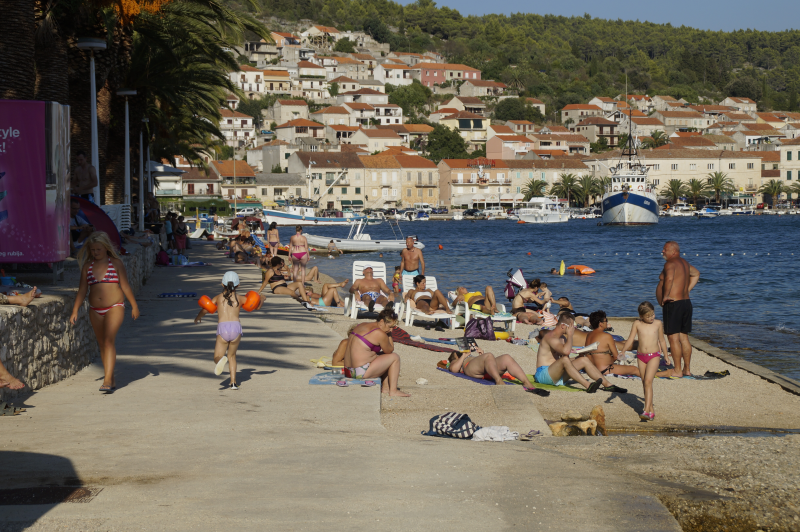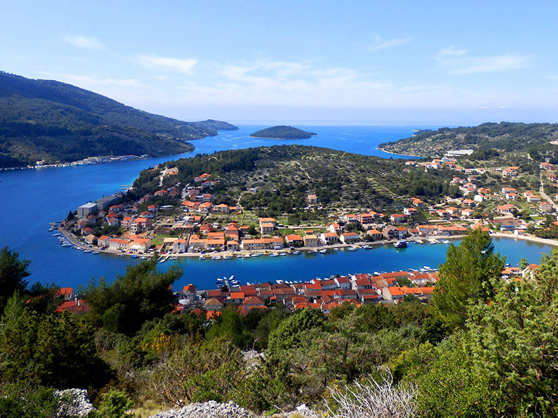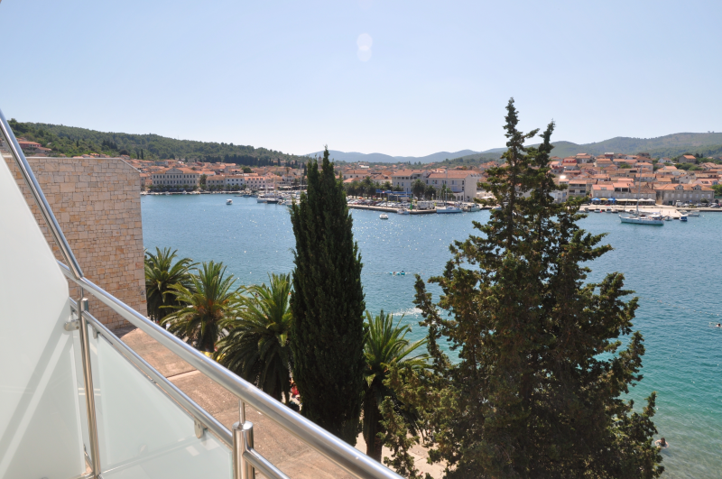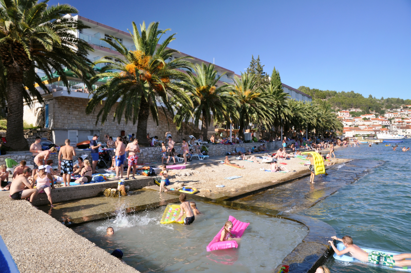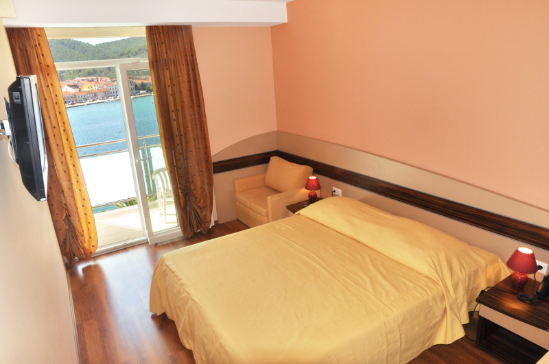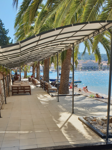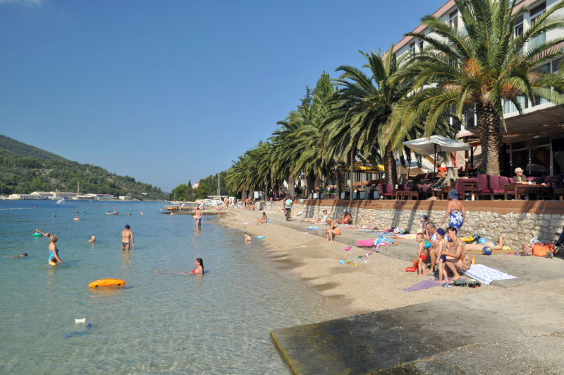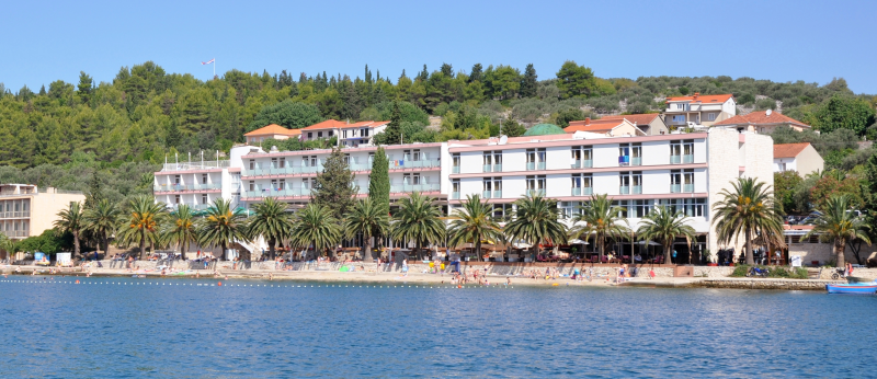 Korcula szigeten, Vela Luka központjától 20 perc sétára, egy hosszú öböllel elválasztva, közvetlenül a pálmafákkal övezett, kiépített és kavicsos tengerparton, pálmafák árnyékában található a felújított két szintes szálloda. Lift nincs.