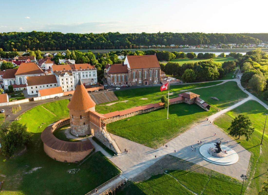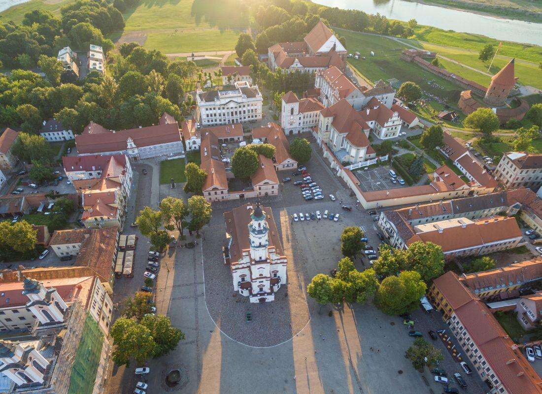 A vár megtekintése után autóbusszal továbbutazás az ország második legnagyobb városába, Kaunasba, mely az ország két legnagyobb folyójának, a Nemunasnak és a Nerisnek az összefolyásánál található. Egy rövid séta a városban. A Nagy Vitold templom, a Dóm és a Perkunas ház a két világháború közötti ideiglenes főváros hangulatát idézi fel.