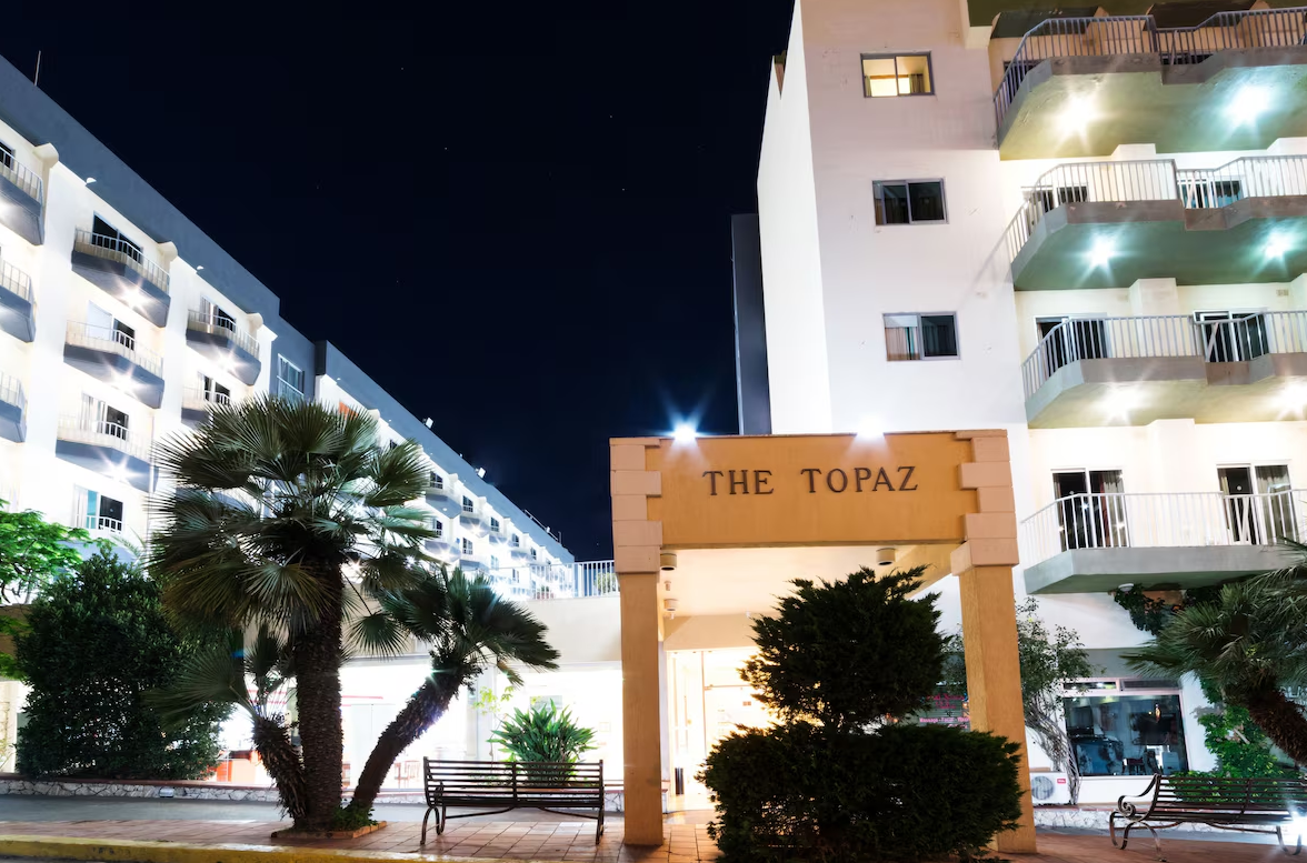 Fekvése: egy fő és két melléképületből álló, nemrégiben felújított kettőszázötvenegy szobás Topaz Hotel, Bugibba üdülőközpontjának szívében, de mégis egy csendesebb utcában, a sziklás tengerparttól tíz perc sétányira található. (kb. hétszáz méter). A tengerparti sétány mellett éttermek, szórakozóhelyek, bárok és üzletek sokasága található. A szálloda közelében található buszmegállóból egyénileg is megközelíthetjük a sziget bármely pontját.