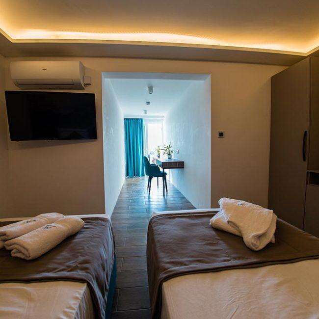 Modern, kényelmes és praktikus, 28 négyzetméteres szoba, melynek erkélyéről zavartalan kilátás nyílik a bájos Xlendi-öbölre. Minden szoba egy hálószobás, modern berendezésű, fürdőszobás, légkondicionálóval, LCD TV-vel, minibárral, telefonnal, WiFi internetkapcsolattal (térítésmentes), felszerelt.
