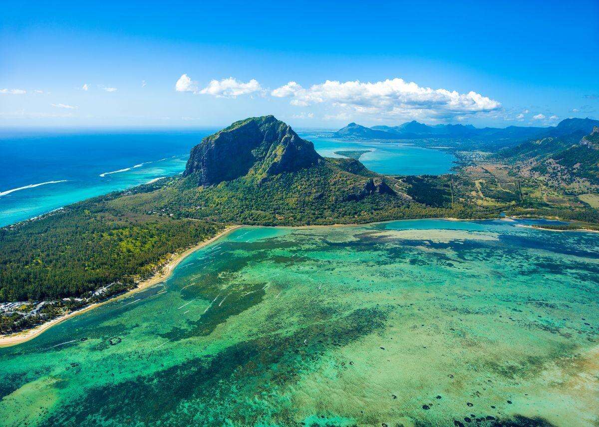 Fedezze fel Mauritiust a magasból, vegye szemügyre az Indiai-óceán hol türkiz, hol mélykék színét, a sziget buja növényzetét, cukornádültetvényeit és Mauritius híres „víz alatti” vízesését.