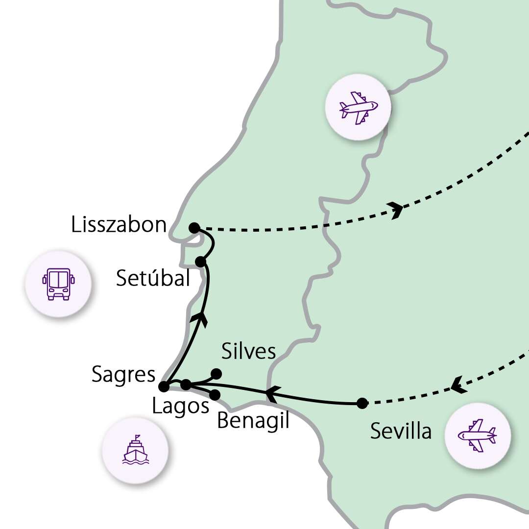 1. NAP UTAZÁS SEVILLÁBA Menetrend függvényében, várhatóan a kora reggeli órákban indul repülőnk Budapestről Sevillába. Megérkezésünket követően Sevillát fedezzük fel: meglátogatjuk a szemkápráztató Plaza de Españát, amelynek hatalmas méreteivel és díszes megjelenésével nehéz betelni. Az épület homlokzatát borító csempéken a spanyol történelem jelentős eseményei elevenednek meg. Sétánk során ezt követően felkeressük az Alcázart, amelyet keresztény uralkodó építtetett mór stílusban, és amely Sevillának egyik legkülönlegesebb palotaegyüttese. Ezután a felbecsülhetetlen értékekkel rendelkező Katedrálist tekintjük meg, ahol Kolumbusz síremléke is található; gazdag belső díszítése miatt Spanyolország egyik legszebb vallási helyeként tartják számon. A Guadalquivir folyóparton lefényképezhetjük a közel 800 éves Aranytornyot, majd élményekkel telve utazunk tovább dél-portugál szállásunkra. 2. NAP LAGOS, SAGRES ÉS A SZENT VINCE-FOK Ma a csodálatos Algarve régió délnyugati partszakaszát fedezzük fel, amely egyedülálló természeti szépségeivel nyűgözi le a látogatókat. Első megállónk Lagos, amely a portugál felfedezések egyik kulcsfontosságú helyszíne volt. Megismerkedhetünk a történelmi város múltjával, és betekintést nyerhetünk abba, hogy milyen szerepet játszott a tengerészeti expedíciókban. Lagos egyik legismertebb látnivalója a Ponta da Piedade, ahol csodálatos sziklákat és barlangokat láthatunk. A tenger ereje formálta fantasztikus alakzataikat. Egy opcionális 1-1,5 órás hajókirándulás során megtekinthetjük ezeket a különleges képződményeket.