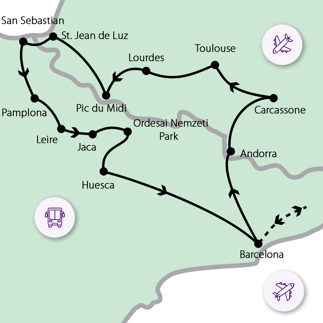 Canal du Midin, amit szintén Világörökségnek nyilvánítottak. Délután tovább indulunk Toulouse-ba. Hamisítatlan dél-francia hangulat és jelentős műemlékek fogadnak bennünket ebben az egyetemi városban, amely a francia nyelv bölcsője. Sétánk során – többek között – látjuk a hatalmas Városházát, a Jakobinus kolostort és a 115 méter hosszú St. Sernin Bazilikát, a románkori építészet egyik legnagyobb alkotását. Toulouse-t elhagyva folytatjuk utunkat a Pireneusok híres zarándokhelyére, Lourdes-ba. Megtekintjük a Csodatévő Barlangot, a jelenés helyszínét, ahonnan az este induló gyertyás körmeneten vehetünk részt – ez az utazásunk egyik megható pillanata. A szabadidőben lesz kegytárgy vásárlási lehetőség. A programunk után szállásunkra utazunk. 3. NAP A PIC DU MIDI PANORÁMÁJA ÉS BASZKFÖLD BÁJA Reggelit követően La Mongie-ba megyünk, ahonnan pompás kirándulást teszünk felvonóval a Pic du Midi 2.876 méter magas csúcsára (extrém időjárási viszonyok esetén a program módosulhat). Ez a Pireneusok leglátványosabb területe. Ahogy egyre magasabbra kapaszkodunk, a táj újabb szépségeit mutatja meg. A kilátás a csúcsról a legpompásabb, elmondhatatlanul szép vidékeket látunk. Körbetekintve óriási területet figyelhetünk meg, csúcsok sokaságát, bizarr szikla képződményeket, havas hegygerinceket. A merészek egy üvegpadlóra is kiléphetnek, ahol, azt a hatást élhetjük át, mintha a levegőben állnánk. Felvonóval érkezünk le és folytatjuk tovább utunkat. A Vizcayai-öböl partján haladva jutunk el a bájos baszk kisvárosba, Saint-Jean-de-Luzba. Baszkföld, sokak meglepetésére, Franciaországba is átnyúlik. Általában az emberek csak a spanyolországi területtel azonosítják, pedig ez a vidék is őrzi népi hagyományait. A városban fellelhetjük a tipikus, fehérre meszelt, baszk házakat széles homlokzattal, bárjaikban olyan jellegzetes süteményeket fogyaszthatunk, mint pl. a cseresznyés lepény. Ezt követően szállásunkra megyünk. 4. NAP A BASZK TENGERPARTTÓL PAMPLONA UTCÁIIG Délelőtt városnézés San Sebastianban, Baszkföld szép fekvésű üdülővárosában, amely Európa Kulturális Fővárosa is volt. Teszünk egy sétát az óvárosban, majd szabadidő a lenyűgöző Kagyló-öbölben, ahol belegyalogolhatunk a hullámzástól mentes, tiszta vizű, bár kissé hűvös óceánba. A szabadidőt követően, aki szeretné, egy hangulatos bárban finom tapaszokat kóstolhat ebédre. Baszkföld tapaszbárjai a leghíresebbek. Tovább utazunk Pamplonába, Navarra tartomány fővárosába, amely elsősorban a híres-hírhedt bikafuttatásáról ismert. Emellett számos látnivalóval is büszkélkedhet. Városnézésünk során megtekintjük a Régi Katedrálist, láthatjuk a Városházát, az Arénát, a románkori San Saturnino templomot és végig megyünk a Santo Domingó utcán, a bikafuttatás helyszínén. Szállás Pamplonánál. 5. NAP A NAVARRAI KIRÁLYOK NYOMÁBAN Reggeli után, csodálatos tájakon folytatjuk utunkat. Először a Sierra de Leire vadregényes vonulatait érjük el. Megtekintjük a Leire kolostort, amelynek régi épülete román, gótikus és barokk stílust egyaránt tükröz. Altemploma sokáig a navarrai királyok temetkezési helye volt. Innen Jacába utazunk, az Aragón folyó fölött elterülő város, I. Ramiro idejében Aragónia első fővárosa volt, amely ma óriási erőddel, hangulatos középkori óvárossal, és az ország legrégebbi katedrálisával büszkélkedhet. A kerengőjében található Egyháztörténeti Múzeum gazdag tárházát nyújtja a káprázatos, aragóniai, románkori falfestészetnek. Szabadidő után, elfoglaljuk szállásunkat Jaca környékén. 6. NAP ORDESA CSÚCSAI ÉS HUESCA TÖRTÉNELMI UTCÁI Utunkat északi irányba folytatjuk, ahol az Ordesai Nemzeti Parkhoz érkezünk. Itt egy gyalogos kirándulás vár ránk egy lélegzetelállító vidéken, ahol égbe törő meredek hegyoldalakat, bájos vízeséseket és gazdag növényzetet csodálhatunk meg. A túra nem megerőltető, mindenki számára teljesíthető, sőt, aki akarja, le is rövidítheti. A séta után déli irányba buszozunk tovább, a gyönyörű hegyekből kopár vidékre érkezünk. Érezhetjük, hogy Aragónia varázsát sokarcúság is jellemzi. Huescába érkezünk, mely Zaragoza visszahódításáig, Jacát követően, volt a tartományi főváros. A város fő látnivalója a felbecsülhetetlen értékekkel rendelkező Katedrális, amelyet belülről is alaposan megtekintünk. Szállásunk Nyugat-Katalóniában. 7. NAP KATALÓNIA SZÍVE, BARCELONA ÉS HAZAUTAZÁS Az utolsó nap, a menetrend függvényében, áttekintést kapunk Katalónia fővárosáról, Barcelonáról. Városnézésünk során megtekintjük a Montjuic-hegyet, a hajókkal teli kikötőt, valamint a la Rambla sétálóutcát, ahol beugorhatunk a híres La Boquería piacra. A piacon gyümölcsöket és egzotikus gyümölcsökből facsart leveket kóstolhatunk, és elámulhatunk a hal- és sonkaválasztékon. A piacon és a Ramblas-on ebédelési lehetőség is nyílik. A