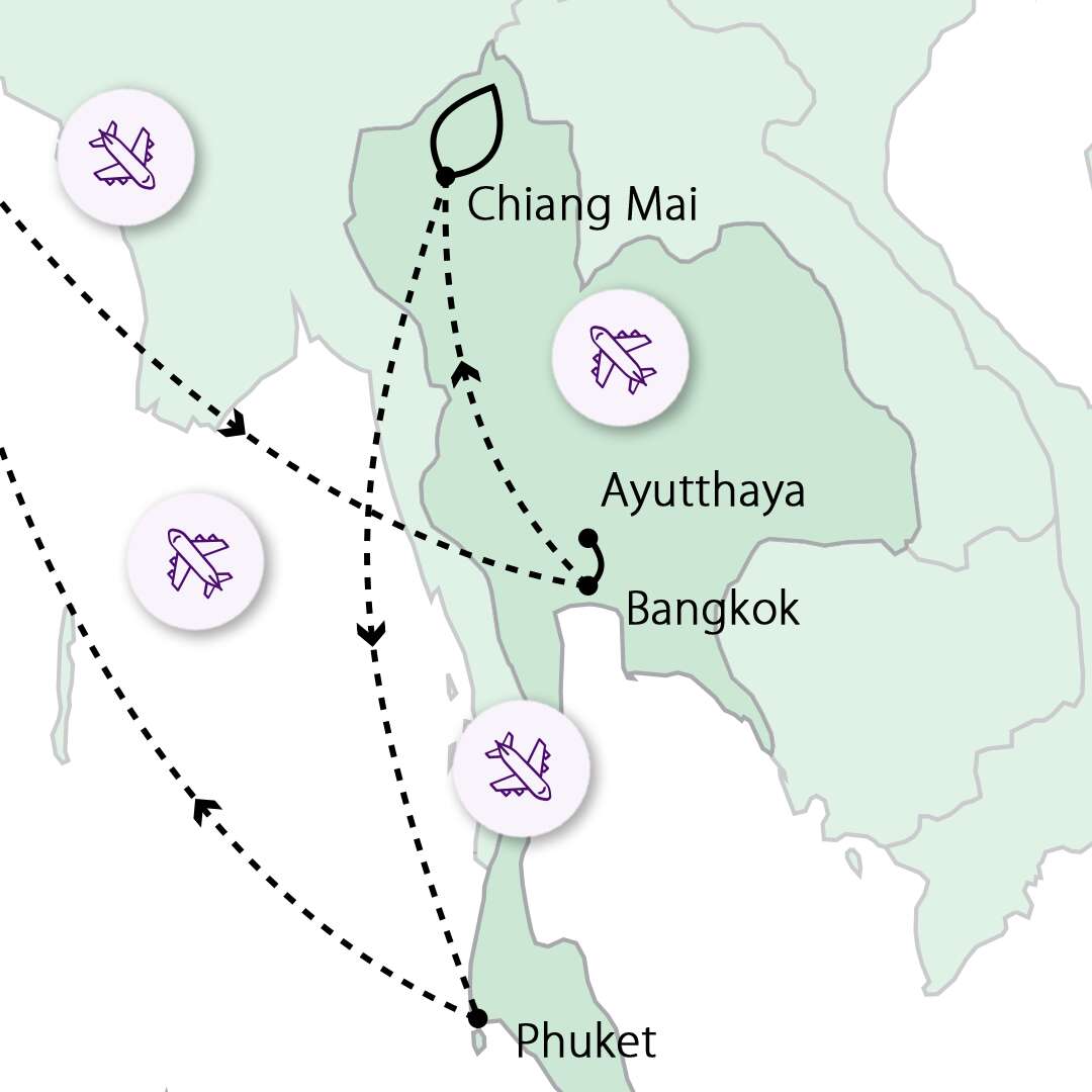 Ayutthayába, elfoglaljuk a szállásunkat, majd rövid pihenőt tartunk. Este tuk-tukos városnézésre indulunk az UNESCO Világörökségi területen. A vacsoránkat egy hangulatos folyóparti étteremben fogyasztjuk el. 5. NAP AYUTTHAYA, MAJD REPÜLÉS CHIANG MAI-BA Reggel Thaiföld egykori királyi fővárosát Ayutthayát látogatjuk meg, ahol a történelem csendje és a romtemplomok időtlen méltósága fonódik össze. Láthatunk ma is működő kolostort, a fák gyökerei között rejtőző Buddha-fejet és közel 400 éves, khmer stílusú királyi templomot. Ezt követően látogatást teszünk a Chao Sam Phraya Nemzeti Múzeumban, ahol királyi aranykincsek és templomokból származó régészeti leletek láthatók. Programunk végén transzfer a repülőtérre, elrepülünk Chiang Mai-ba. Szállás (4 éj), vacsora. 6. NAP CHIANG MAI FELFEDEZÉSE Reggeli után tuk-tukkal indulunk a Kad Luangra, mely Chiang Mai legnagyobb piaca. Friss élelmiszerek, helyi snackek, hagyományos ruhák és jellegzetes regionális termékek várják a látogatókat. Ezt követően rövid séta a közeli Kad Meo piacra. A piac főként kézműves tárgyairól és színes textíliáiról ismert. Tuk-tukkal továbbutazás a Thapae úton keresztül az Óváros falaihoz, majd látogatás a Wat Phra Singh templomnál. A templom a lanna építészet egyik legszebb példája. Láthatjuk a Viharn Lai Khan-t, Észak-Thaiföld legimpozánsabb szent könyvtárát. A látogatás után transzfer a kikötőbe, ahol megkóstolhatjuk Csang Mai híres, curry-s tésztalevesét. Napközben lesz szabadprogram is. Ebéd után kisbusszal indulás a Wat Phra That Doi Suthep templomhoz, Chiang Mai ikonikus szent helyéhez. Este szállás. 7. NAP ARANYHÁROMSZÖG TEMPLOMAI A napunk első állomása a Wat Rong Khun (Fehér Templom), mely egy modern mestermű, amelyet tükröződő mozaikok díszítenek. Ezt követően ellátogatunk Karenbe a hosszúnyakúak falujába, ahol megismerhetjük a hegyi törzs hagyományait. Ebédünket egy tipikus helyi étteremben fogyasztjuk el. Továbbutazás az Arany Háromszögbe, ahol Thaiföld, Laosz és Mianmar határa találkozik. Csónakázunk a Mekong folyón, majd megtekintjük az Ópium Múzeumot. Visszaút Chiang Maiba, útközben megálló a Wat Rong Suea Ten-nél (Kék Templom), amely lenyűgöző, kobalt-kék belső teréről ismert. Szállás, mint előző napokon. 8. NAP MAE WANG-VÖLGY, ELEFÁNT OTTHON Mai napunk egészét a Mae Wang-völgyben töltjük tartalmas programokkal. A folyón bambusz tutajjal egy vízeséshez megyünk. Ezt követően ellátogatunk egy elefánt otthonba, ahol a bátrabbak részt vehetnek az állatok etetésében és fürdetésében. Délután visszaérkezés Chiang Mai-ba. Este khantoke vacsorán veszünk részt: hagyományos északi thai étkezés tálcákon felszolgálva, Lanna kulturális táncprodukcióval kísérve. 9. NAP BÚCSÚ CHIANG MAI-TÓL, UTAZÁS PHUKETRE Reggeli a szállodában, majd transzfer a Chiang Mai repülőtérre, és elrepülünk Phuketre. Transzfer a tengerparti szállodába. A nap hátralévő részében szabadprogram és pihenés. 10. NAP PHUKET FELFEDEZÉSE A mai nap során végighaladunk a sziget festői tengerparti útjain, miközben lenyűgöző kilátás nyílik a partvonalra. Fotós megállót teszünk a Karon kilátópontnál, ahonnan Kata Noi, Kata Yai és Karon strandjai, valamint az Andamán-tenger panorámája tárul a szemünk elé. Ezt követően felfedezzük Phuket óvárosát, amely a kínai kereskedők örökségét és a színpompás szino-portugál építészetet ötvözi. Ellátogatunk a Wat Chalong-hoz, a sziget legfontosabb és legszebb kolostorához, amely szent relikviáiról és különleges atmoszférájáról ismert. A napot a híres Promthep-foknál zárjuk, ahol a sziget egyik legszebb naplementéje tárul a szemünk elé. 11-12. NAP PIHENÉS ÉS FAKULTATÍV PROGRAMOK Ezen a két napon mindenki eldöntheti, hogy pihen a szálloda tengerparti strandján vagy választ a fakultatív programjaink közül: