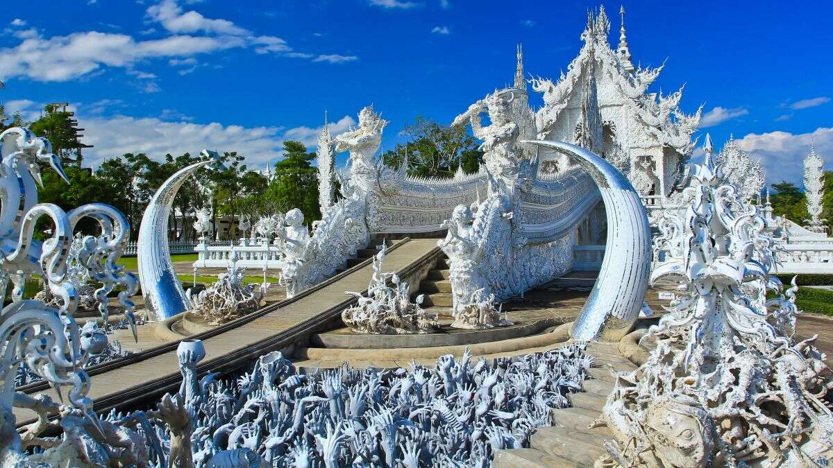 Reggeli után kijelentkezés a szállodából, majd számos látványos hely érintésével utazás festői útvonalon Chiang Raiba. Wat Rong Khun, más néven a Fehér Templom meglátogatása. . A csillogó Fehér Templom csipkézett csúcsai egy zöldellő kertből emelkednek ki, szerkezete elegánsan tükröződik a szomszédos tó felszínén. A kortárs buddhista templom stílusában az ősi művészeti jegyeket is hordozza; tervezője a thai Gaudí-ként is emlegetett Chalermchai Kositpipat. Megérkezés után bejelentkezés a szállodába, ahol közös vacsora.