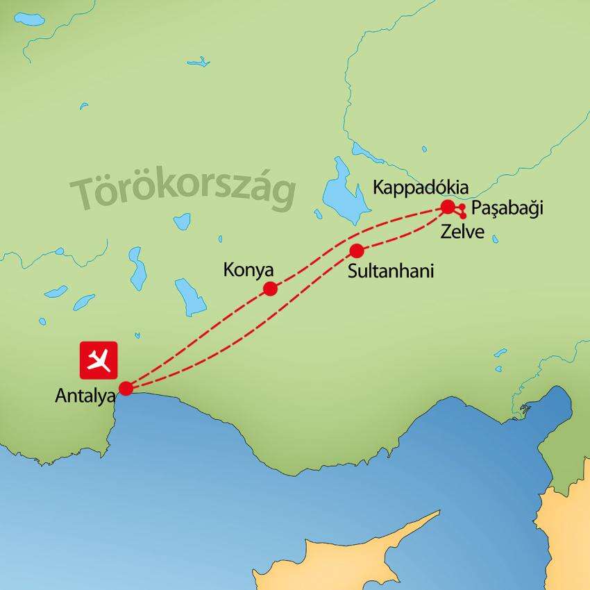 Paşabağı, vagy másnéven a Szerzetesek Völgye az első állomásunk, ahol a Tündérkémények elképesztő látványa fogad minket. Ezeket az egyedülálló formációkat a víz és a szél ereje alakította ki, és misztikus alakzatokként emelkednek ki a földből. Tegyen egy sétát ebben az elvarázsolt mesebirodalomban, és csodálja meg a kövekbe vésett részleteket, melyeket a természet művészi keze alkotott meg! Innen egy kőhajításnyira található Zelve történelmi falucskája. Ez a szabadtéri múzeum betekintést enged a múltba, a tufasziklákba vájt vulkanikus barlanglakások, templomok, kolostorok egy bámulatos világot tárnak fel előttünk. Fedezze fel a sziklák között labirintust formáló utakat, csodálja meg a kövekbe vésett formákat! Felkeresünk egy szőnyegkereskedést. A szőnyegek élénk színei, bonyolult mintái és változatos motívumai mind a készítőik történelméről és kézműves tudásáról tanúskodnak. Ezeknek az üzleteknek a felfedezésével a látogatók mélyebb betekintést nyerhetnek a török kultúrába. Szállás Kappadókiában.