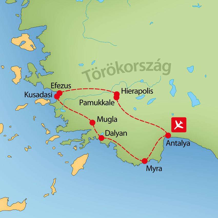 Repülőjegy oda-vissza Repülőtéri illeték Feladott poggyász, kézipoggyász Transzferek Minőségi, 4 és 5* szállodák Reggeli Magyar nyelvű csoportkísérő Izgalmas, látványos kirándulóprogramokat modern buszokkal: Myra, Szent Miklós -templom, Efezus, Pamukkale, Hierapolis, Antalya a program alapján.