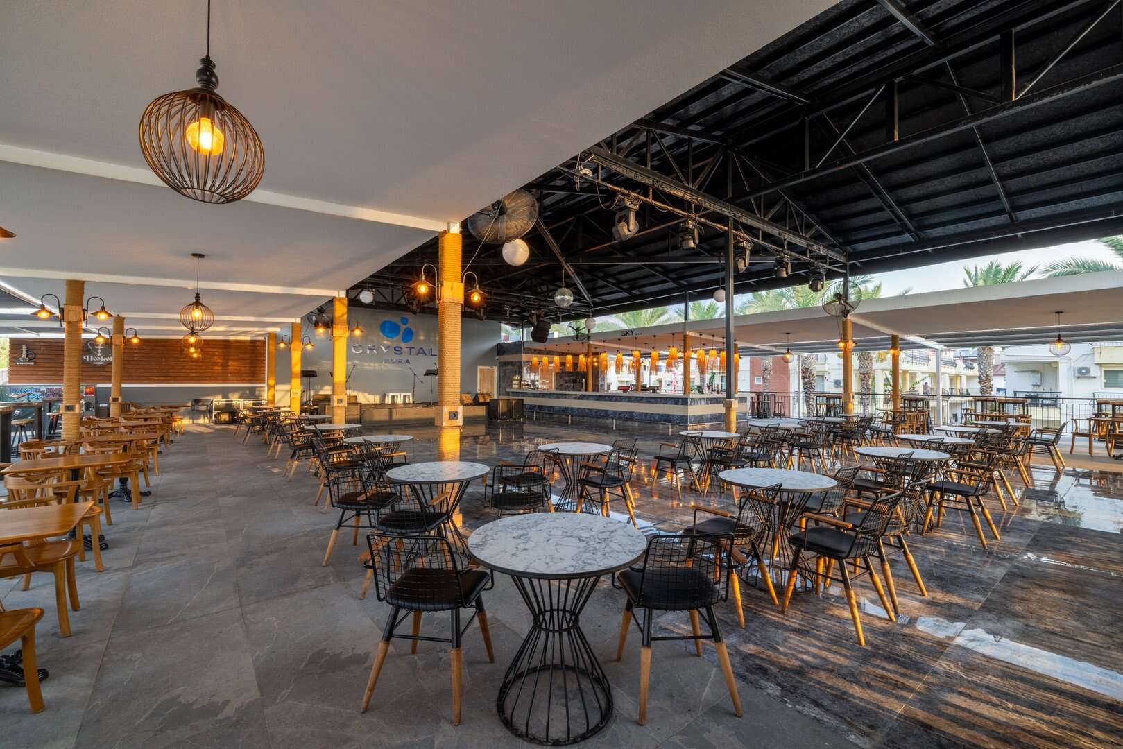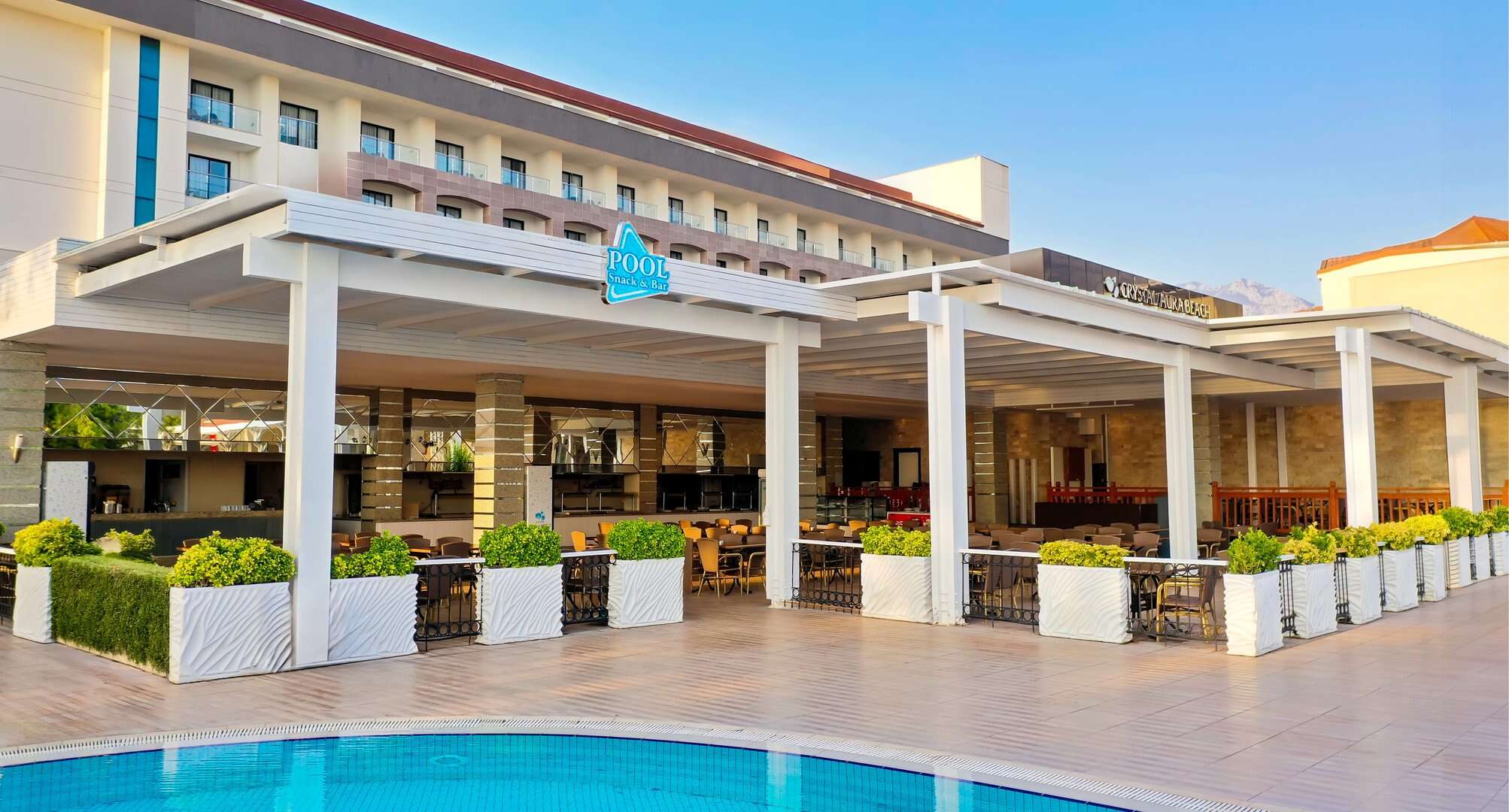 A Crystal Aura Beach Resort közvetlen közelében egy saját kavicsos strand található. A strand minőségéért és tisztaságáért kék zászlóval tüntették ki. A napozóágyak, matracok, napernyők és törölközők ingyenesen állnak rendelkezésre. Van egy Ultra All Inclusive strandbár.