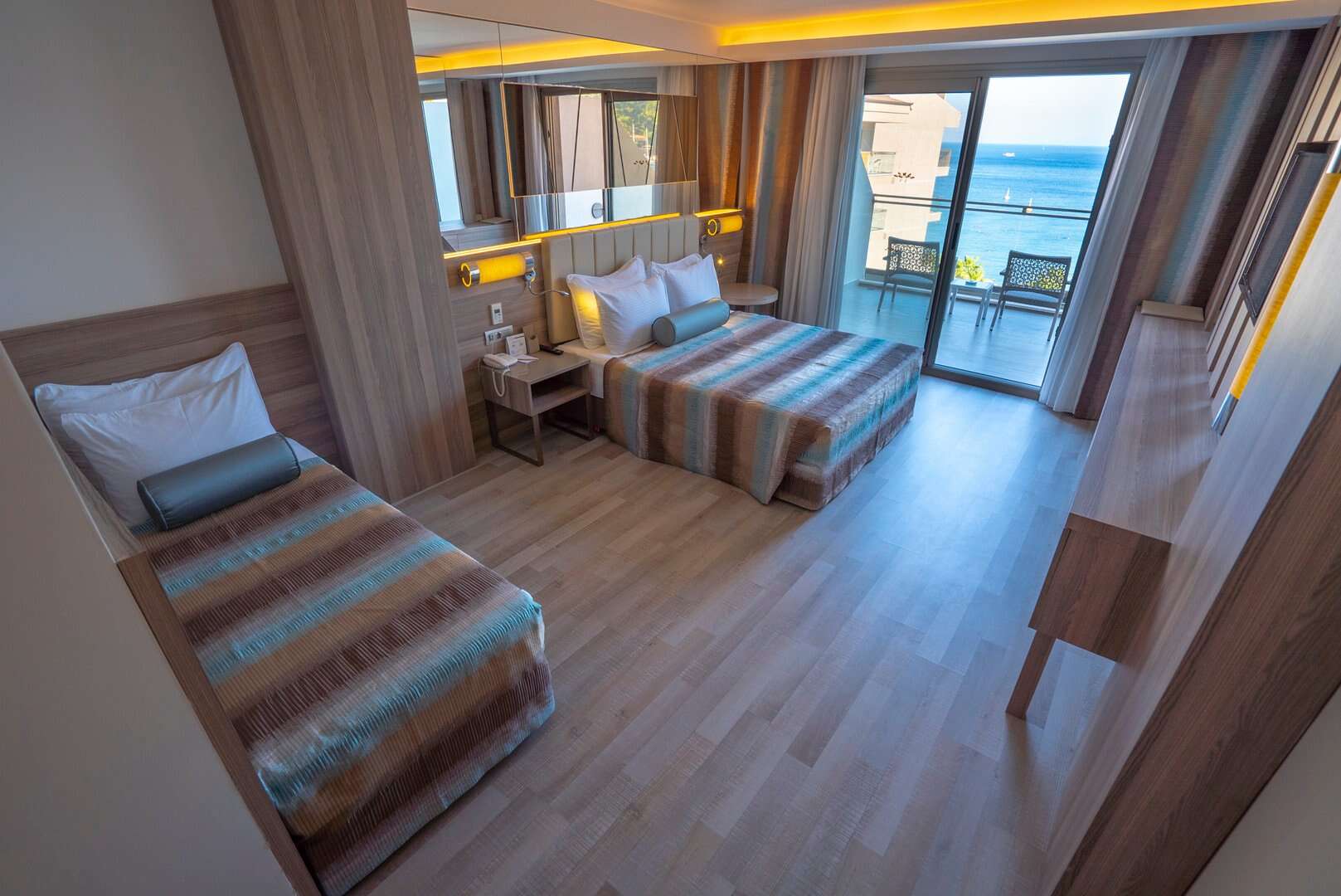 Elérhetőek standard tájra néző kétágyas pótágyazható szobák, kétágyas oldalról tengerre néző pótágyazható szobák, kétágyas tengerre néző pótágyazható szobák (kb. 30m2). A szobákban rendelkezésre áll fürdőszoba, WC minibár, hajszárító, széf, telefon, erkély asztallal és székekkel, LED TV, légkondicionáló, vízforraló.