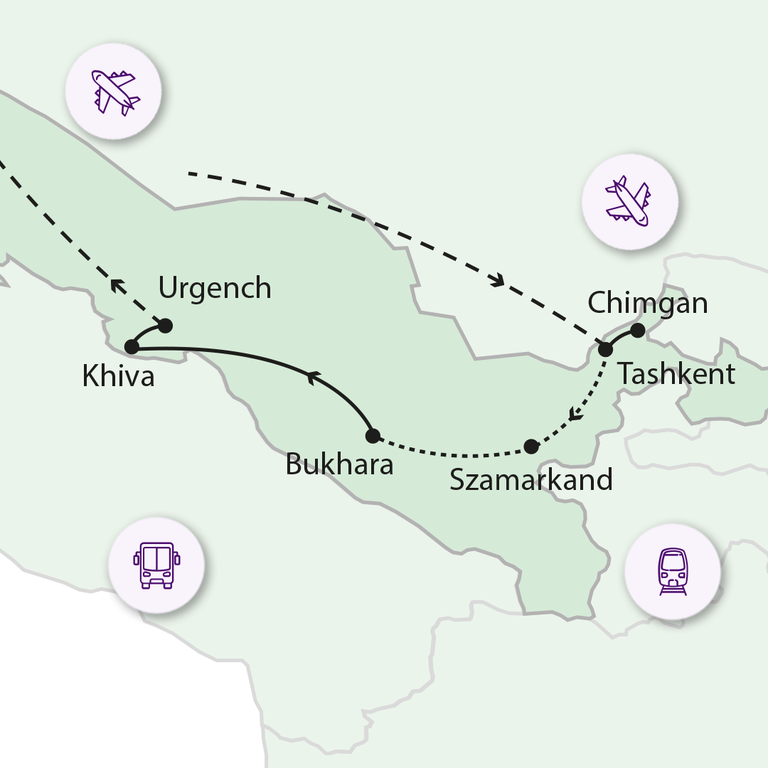 - Elhelyezés: 4*-os szállodák 2 ágyas szobáiban, 1 éjszaka Taskentben, 2 éjszaka Szamarkadban, 2 éjszaka Bukharaban, 2 éjszaka Khívában