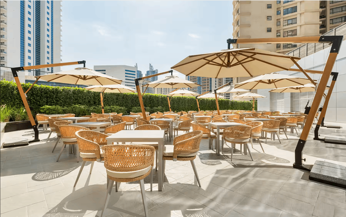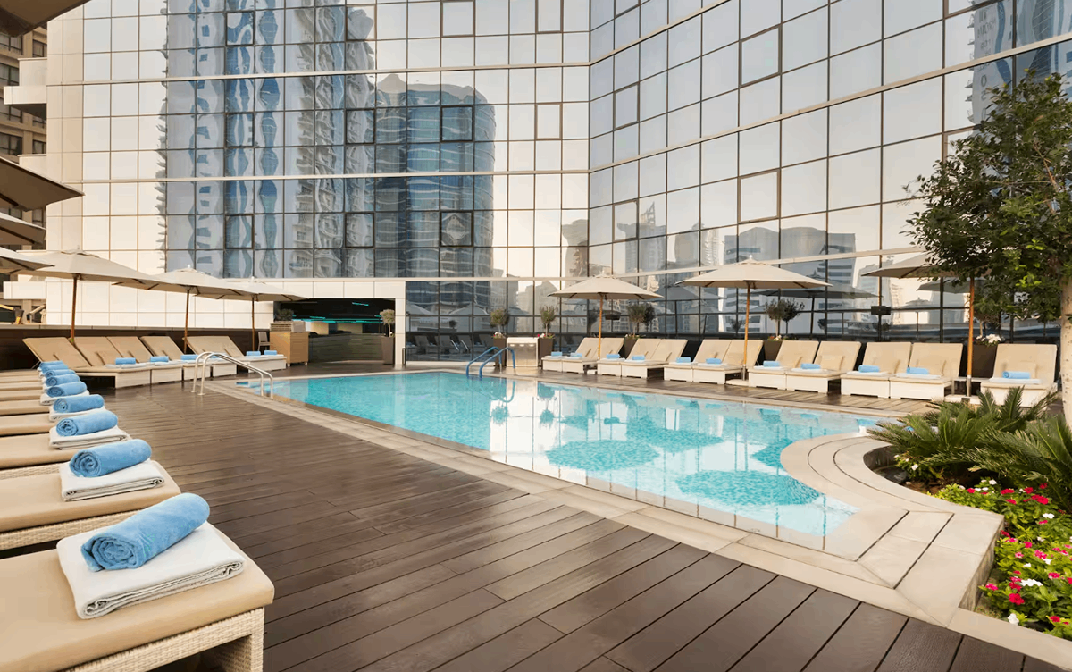 Dubai nevezetességei közelében található 650 szobás modern hotel. A homokos tengerpart közelében épült, ahova ingyenes buszjáratot működtett a szálloda.