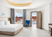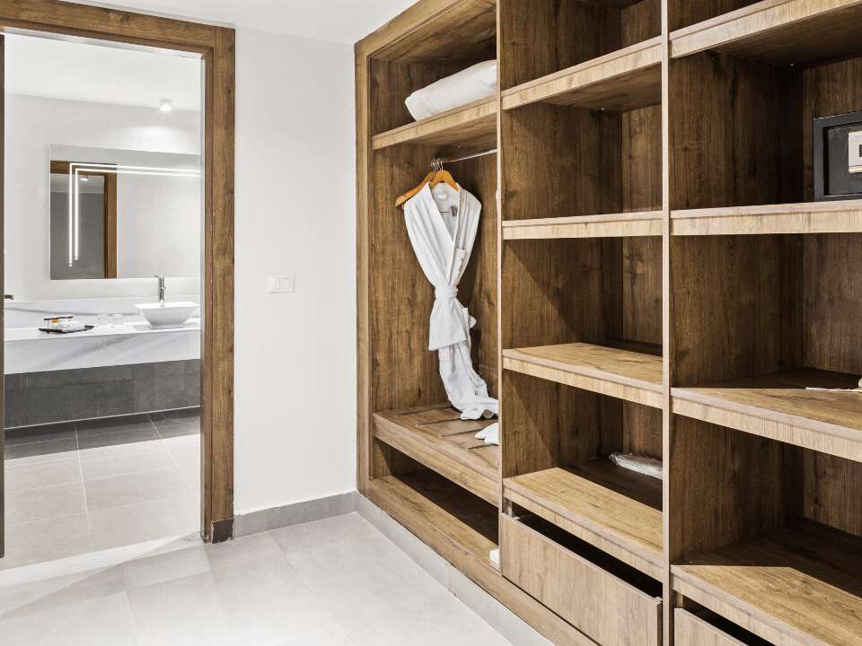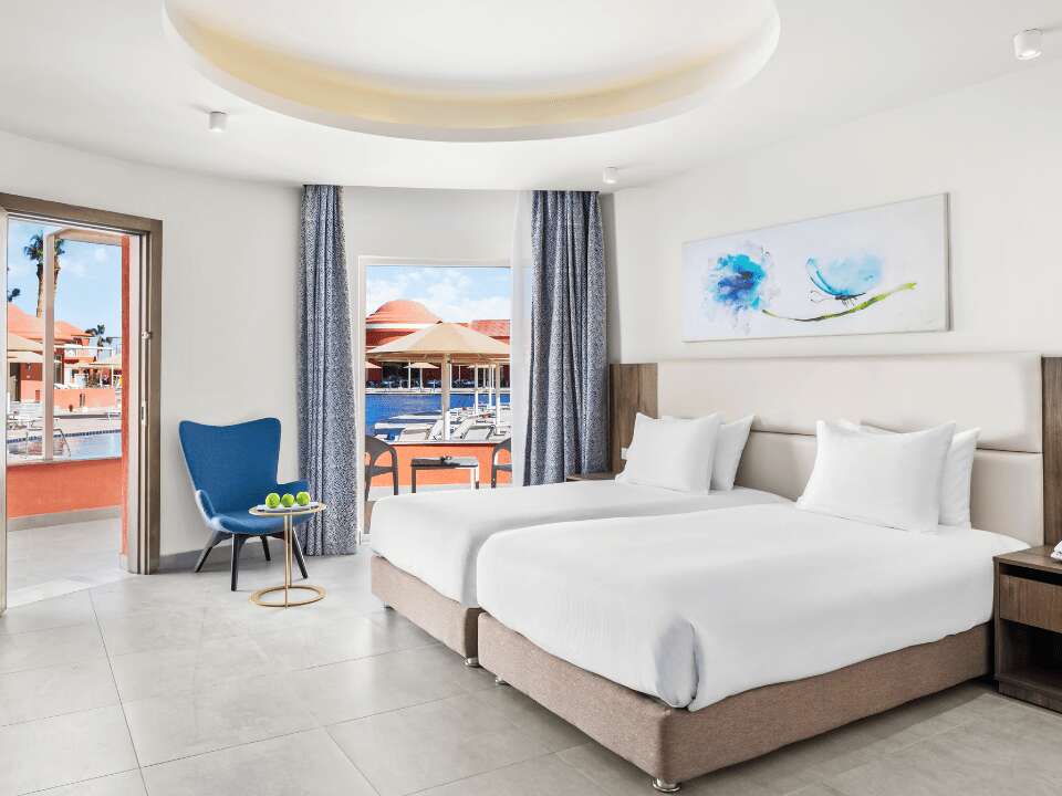 Kétágyas deluxe szoba kertre néző kb. 55 nm , felár ellenében foglalható medencére néző kilátással is.