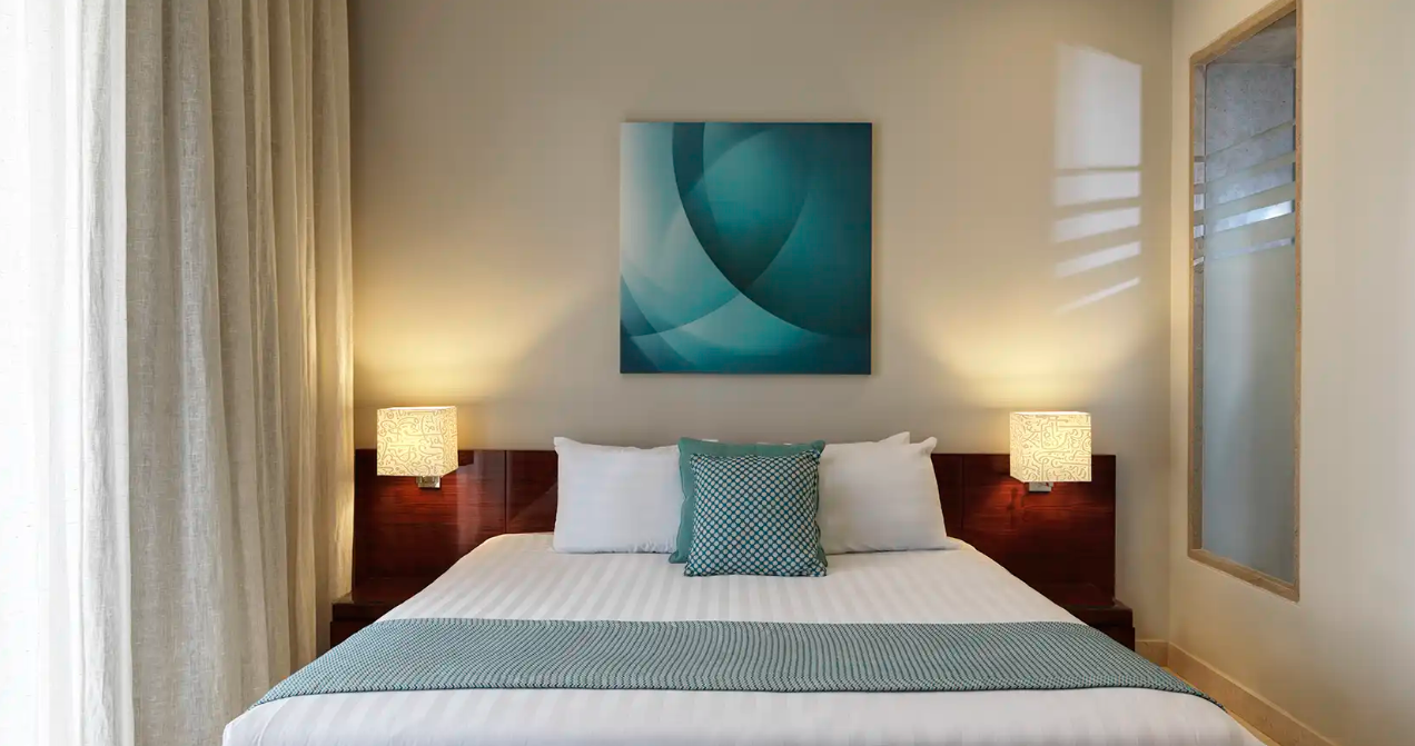 A modern kétágyas szobák (DZ) 32 m² fürdőszobával, zuhanyzóval, hajszárítóval, fürdőköpennyel, tea- és kávéfőzési lehetőséggel, légkondicionálóval (egyedileg szabályozható), telefonnal, síkképernyős TV-vel, Wi-Fi-vel, minibárral (térítés ellenében), széffel, valamint erkéllyel vagy terasszal felszereltek. Az egy (1AP) 77m² hálószobás felszereltsége megegyezik a standard szobákkal (zuhanyzó vagy fürdőkád), és a szabad helyek függvényében foglalhatók. A kékek, sárgák és zöldek élénkséget kölcsönöznek a nyitott terű nappalinak és a teljesen felszerelt L alakú konyhának. A legfeljebb három felnőtt és egy gyermek elszállásolására alkalmas, hosszabb tartózkodásra is tökéletesen alkalmas. A king-size ággyal vagy 2 külön ággyal és egy pótággyal ,gyönyörködjenek az erkélyről vagy teraszról a környező kertekre, a medencére vagy a golfpályára nyíló kilátásban. A két hálószobás (A2P) apartmanok 100m² lakótér számtalan lehetőséget kínál a nap eltöltésére, akár négy felnőtt és két gyermek számára is. A két hálószoba mellett, amelyekben különféle king- és ikerágyas lehetőségek állnak rendelkezésre, egy nyitott konyha is a nappali részét képezi, míg két teraszról a környező kertekre, a medencére vagy a golfpályára nyílik kilátás. Az olyan kényelmi felszerelések, mint a kávéfőző, a hajszárító, a mosógép, a mosogatógép és a fürdőköpenyek mind le vannak fedve, így ez ideális választás hosszabb tartózkodáshoz is.