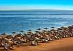 Közvetlen a homokos tengerparton, ahol a napernyők és ágyak használatát az ár tartalmazzta.
