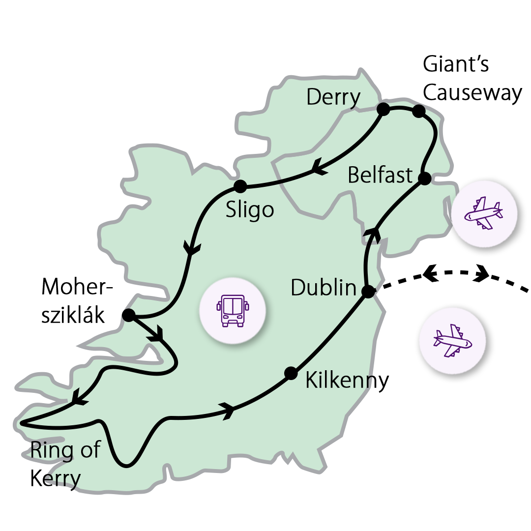Giant's Causeway-t (az Óriások Útja) keressük fel, melyet több ezer különleges alakú bazalt oszlop alkot. Nem véletlenül választották be az UNESCO Világörökségei közé. Délelőtt még láthatjuk a lenyűgöző Dunluce kastélyt, amely a tenger fölé magasodó romjaival idézi fel a múlt idők történelmi hangulatát, majd máris indulunk Bushmills kisvárosába, ahol lehetőség lesz ebédelni is. Délután egy rövid városnézés keretében ismerkedünk É-Írország második legnagyobb városával, Derry-vel: sétálhatunk a XVII. századi városfalak tetején, és érdekes falfestményeket láthatunk. Szállás Sligo környékén. 3. NAP BURREN KŐVIDÉKE ÉS A MOHER-SZIKLÁK VILÁGA Reggel a Burren Nemzeti Parkba megyünk, ahol több megalitikus sír, kelta kereszt és régi templom található. Egészen különleges növényvilágot csodálhatunk meg a látványos, lapos sziklák között: a sarkköri növényektől egészen a szubtrópusi találhatunk itt egyedeket. Következő utunk a világhírű Cliffs of Moher-hez vezet, ahol sétát teszünk a kanyargó, meredek, fantasztikus sziklafal mentén, mely 8 km hosszan, 230 m-es óriásként magasodik a félelmetesen morajló Atlanti-óceán fölé. Utunk egyik csúcspontja az itt elénk táruló látvány. Jó idő esetén a tenger felől egy hajókázás keretében is megtekinthetjük a Moher-sziklákat. Szállásunk ennek közelében található. 4. NAP VÁRKASTÉLYTÓL AZ ÓCEÁNIG Ez a nap sem múlhat el történelem nélkül, így első megállónk a Bunratty várkastély, ami az ország egyik legjelentősebb középkori erődje és egyben lakótornya. A mellette lévő skanzenben bepillantást nyerhetünk a XIX. sz-i falusi és kisvárosi életbe is. Innen Limerick érintésével a vadregényes Dingle-félsziget felé vesszük az irányt, ahol az ír vidék lenyűgöző, zöldellő dombjai és az óceán látványa kíséri utunkat. Megállunk egy sétára a széles, homokos Inch Beachen, ahol a friss tengeri szellő és a végtelen horizont nyugalmat áraszt. A nap végén megérkezünk Killarney környékére, és elfoglaljuk szállásunkat (2 éj). 5. NAP HEGYEK, TAVAK ÉS ÓCEÁN: A RING OF KERRY Reggeli után a világ egyik legszebb panoráma útjának választott Kerry-gyűrűt járjuk be. Az út során lenyűgöző kontraszt tárul elénk: hegyek, tőzegmocsarak, tavak és fantasztikus kilátás az Atlanti-óceánra. A 180 km hosszú úton érintjük az ír nemzeti hős, Daniel O’Connell szülőhelyét is. Az egész napos túrát számos fotószünettel szakítjuk meg. Élményekkel telve érünk vissza szállásunkra. 6. NAP CAHIR, CASHEL ÉS KILKENNY VÁRAI DUBLIN FELÉ Reggel elindulunk a festői Cahir Várához, amely egy folyóparti szigeten áll, és impozáns tornyaival az egyik legjobban megőrzött középkori erődítmény Írországban. Következőnek a Cashel sziklához látogatunk el, mely szintén Írország egyik fő látványossága. Egykor ez a hely a casheli érsekség székhelye volt. Ma a lenyűgöző sziklák gyűrűjében egy körtornyot, egy gótikus katedrálist és egy román stílusú kápolnát találunk. A különleges épületek megtekintése után folytatjuk utunkat a márványvárosként is emlegetett Kilkennybe. Ez a település adja vissza legjobban egy középkori ír város hangulatát épületeivel, kanyargós utcáival. Kilkenny egyik meghatározó épülete a Kilkenny-kastély, melyet a normannok építettek a XII. században. Kívülről és belülről is bejárjuk a kastélyt. Szabadprogramunk során lesz lehetőség megkóstolni a város híres termékét, a vörös sört. Szállás Dublinban (2 éjszaka). 7. NAP DUBLIN: O’CONNELL STREETTŐL A GUINNESSIG Reggeli után buszos városnéző túrára indulunk. Végig hajtunk az O’Connell Streeten, a főutcán, melynek legfőbb nevezetességei az ír hősök tiszteletére készült Emlékezés kertje, a postahivatal, az 1916-os felkelés helyszíne. Ezután átmegyünk a Liffey folyón, ahol a Félpennys hidat is láthatjuk. Ezután a két legnagyobb protestáns templom vár ránk: az írek védőszentjéről elnevezett színes Szent Patrik-székesegyház és a Krisztus Katedrális, melyet 1172 ben az angol-normannok építettek egy korábbi, vikingek által emelt templom helyébe. A híres Guinness sörgyárnál folytatjuk kirándulásunk. Az 1904-ben nyílt Guinness Storehouse-t raktárként használták, ma azonban a Guinness történetét bemutató múzeum. A látogatók megtekinthetik, hogyan készül az „életelixír”, kezdetektől egészen a fogyasztásig. Természetesen kóstolásra is lesz lehetőség. A Phoenix park érintésével térünk vissza a belvárosba, ahol szabadidőnk lesz. Délután meglátogatunk egy whiskeylepárlót, ahol megismerkedhetünk a nemes nedű gyártási folyamatával és meg is kóstolhatjuk azt. Szállás ugyanott Dublinban. 8. NAP HOWTH PARTJA, MALAHIDE KASTÉLYA, HAZAÚT Reggel a Trinity College épületével folytatjuk, melyet I. Erzsébet királynő alapított 1592-ben, ez az ország legrégebbi egyeteme. Régi könyvtárában ősi kódexeket tekinthetünk meg, pl. a Book of Kells-t. Következő állomásunk az elegáns Merrion tér, ahol építészeti remekek és színes, boltíves kapuk találhatók. Elhagyva a fővárost egy kellemes sétával folytatjuk a napot a Howth festői tengerparti útvonalán, majd ellátogatunk a Malahide kastélyhoz, ahol felfedezzük a gazdag történelmi hangulatot árasztó termeket és a gondozott parkot, ahol egy lepkekiállítás is színezi a látványt. Írországtól búcsúzva a repülőtérre megyünk és Budapestre utazunk.