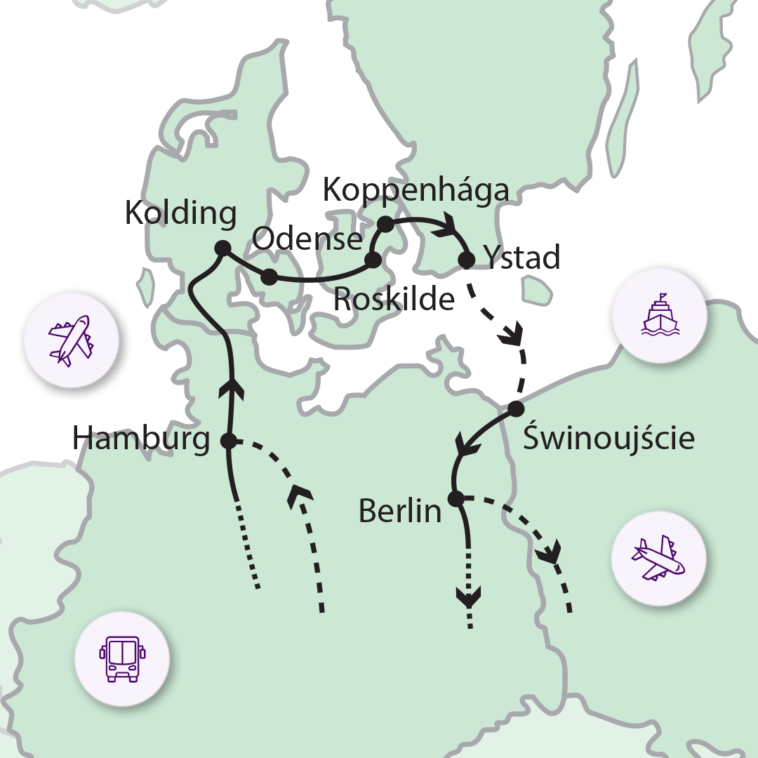 Christiansfeldbe. Ezt a városkát 1773-ban a király parancsára építették. Ez volt a tökéletes város az egyház elképzelései alapján. Különlegessége miatt az UNESCO Világörökségnek nyilvánította. Tovább utazunk Koldingba. Itt megnézzük a város híres kastélyát, amely az első királyi rezidencia volt Dániában. A város ma már kreatív- és kézműves központ. Programunk végén elfoglaljuk szállásunkat. 3. NAP Fyn szigete, Odense és a mesés Egeskov Reggel egy hídon átkelve a Funen szigetre érkezünk. A nagy dán mesemondó, Andersen is ezen a szigeten élt. Először megnézzük Fyn városát, mely egy skanzen. Bemutatja, hogy éltek a dán emberek az 1800-as években. A több mint 25 farmházból álló múzeumban profi színészek segítségével ismerhetjük meg a falusi emberek életét. Tovább haladva Odensébe érünk, amely e kis sziget „fővárosa” és Dánia 3. legnagyobb városa. Itt született és nevelkedett Andersen. Meglátogatjuk szülőházát, illetve az életéről és munkásságáról szóló múzeumot is. A szűk és kanyargós kis utcákon sétálva megelevenedik előttünk mindaz, melyről történeteiben mesél. Következő állomásunk Egeskov kastélya lesz. Fyn 123 kastélya közül ez a legszebb. A kastély gróf Ahlefeld család tulajdona. A csodálatos kertben is sétálhatunk, amely bekerült a világ 12 legszebb kertjének rangsorába. A kastélyt elhagyva egy újabb hídon kelünk át és utazunk tovább szállásunkra. 4. NAP Roskilde és Koppenhága, este átkelés Ystadba Reggeli után Roskilde központjába megyünk. A várost Kékfogú Harald (akiről a Bluetooth-t nevezték el) alapította 980-ban. Miután a katolicizmus megjelent Dániában, Roskilde lett a vallási központ. Nyitásra érkezünk a