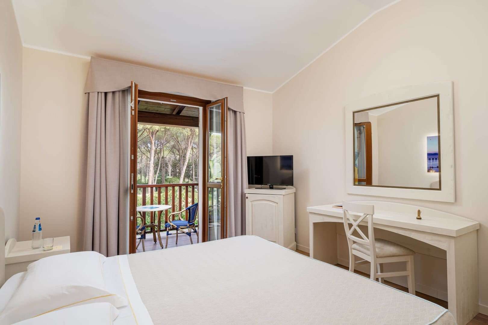 - Kétágyas/kétágyas szoba kertre néző kilátással: 19 m2; néhányukhoz erkély tartozik asztallal és székekkel, másokhoz kis terasz , ezek a szálloda belső oldalára vagy a fenyőerdőre és a kertre néznek.
