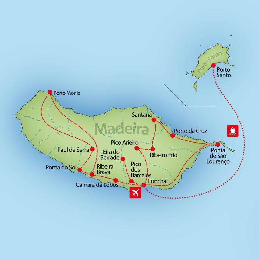 3. nap – Kelet-Madeira (egész napos)A napunknak látványos kezdést biztosít a sziget egyik legmagasabb pontja, a Pico do Arieiro, mely 1818 méter magas. Innen álomszép kilátás nyílik a környező, zöldellő lankákra, és a sejtelmes felhőkre. Tiszta időben akár a Paul de Serra fennsíkon lévő szélturbinákat is megpillanthatjuk. Majd a Ribeiro Frio völgyben a laurisilva, azaz babérerdő vár ránk. Megállunk egy kis levada túrára. A levada egy tipikus madeirai turistaútvonal, mely a növények ellátását biztosító vízcsatornák köré épült. Körülbelül 25 perces ballagás után érjük el a Balcões kilátópontot. A buszunkhoz visszafelé egy újabb, kb. 20 perces gyaloglás vezet. Majd Santana varázsol el minket jellegzetes, háromszöget formázó kis faházaival. Majd elhaladunk Porto da Cruz, illetve a sziget jelképének számító Sas-szikla, azaz Penha d'Águia mellett. Kihagyhatatlan élményt ígér a rumfőzde Engenhos do Norte-nál. A nap méltó zárását jelenti Ponta de São Lourenço, Madeira legkeletibb pontja, ahonnan elénk tárul az északi és a déli part is. Visszatérés a hotelbe.