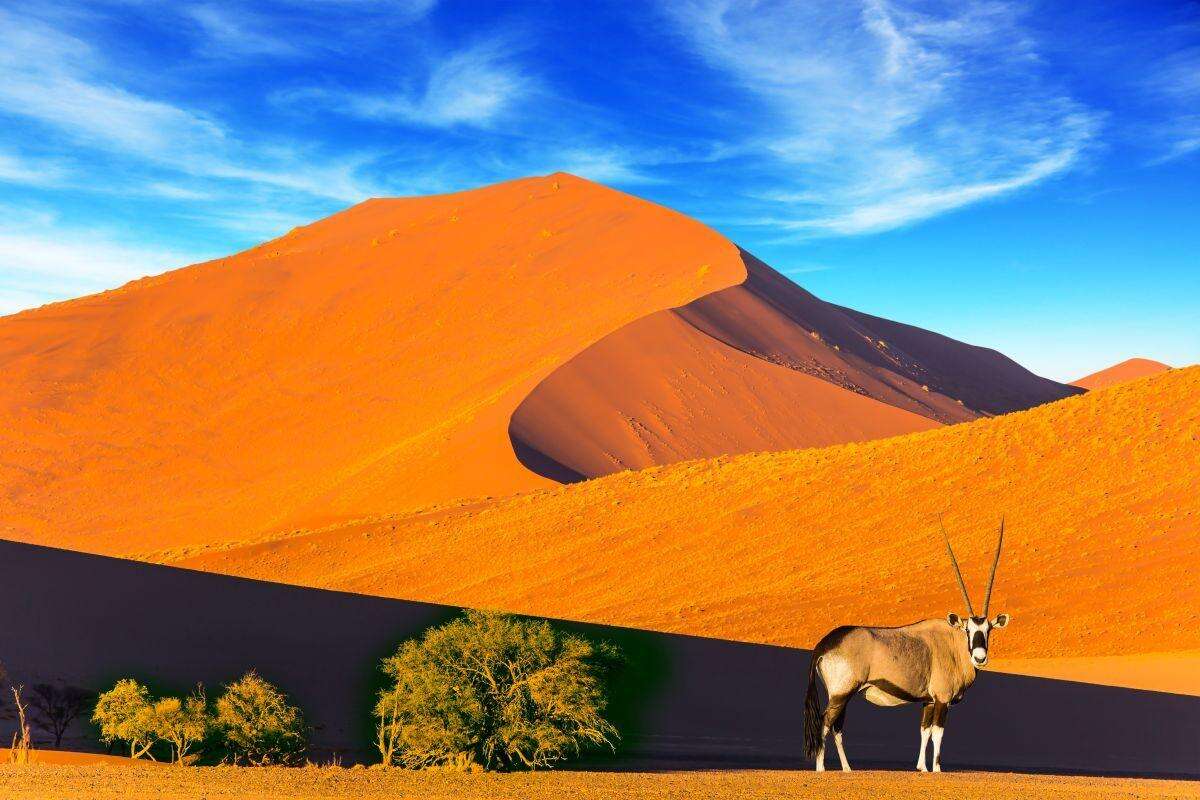 Esti bécsi indulással, addisz-abebai átszállással utazás Namíbiába. Éjszaka a repülőn, érkezés Windhoekba másnap, a kora délutáni órákban. Utazás Rehoboth-on, a baaster népcsoport szülőföldjén keresztül a világ legrégibb sivatagjába, a jellegzetes vörös homokdűnéiről híres Namib-sivatagba. Késő délutáni érkezés a szálláshelyre, rövid pihenő, majd naplemente dzsiptúra a Namib-sivatagban: nyitott terepjárókkal fedezzük fel a Gondwana Namib Park területének vörös homokdűnéit, a sivatagi alkonyat különleges békéjét. Szállás: Sesriemben (1 éj).