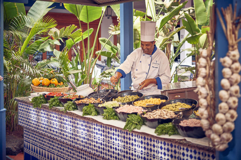 A hotel fő étterme a kulináris sokszínűségéről ismert, ízletes ételeket kínálnak stílusos és kényelmes környezetben. A tágas teraszon kanári és nemzetközi finomságokat fogyaszthat a melegítő napsugarak vagy a csillagokkal tarkított éjszakai égbolt alatt. A vacsora a Seaside Los Jameos Playa különleges fénypontja. Naponta változó tematikus estek, kerti grill és gálaestek tarkítják a kulináris élményeket. A medence melletti snackbárban gyermekmenü várja a gyermekeket. A Piano illetve Belingo bárban pedig élőzenés showműsorral, frissítő italok és koktélok széles választékával várják. Az előírt viselet az uraknak vacsorához hosszúszárú nadrág!
