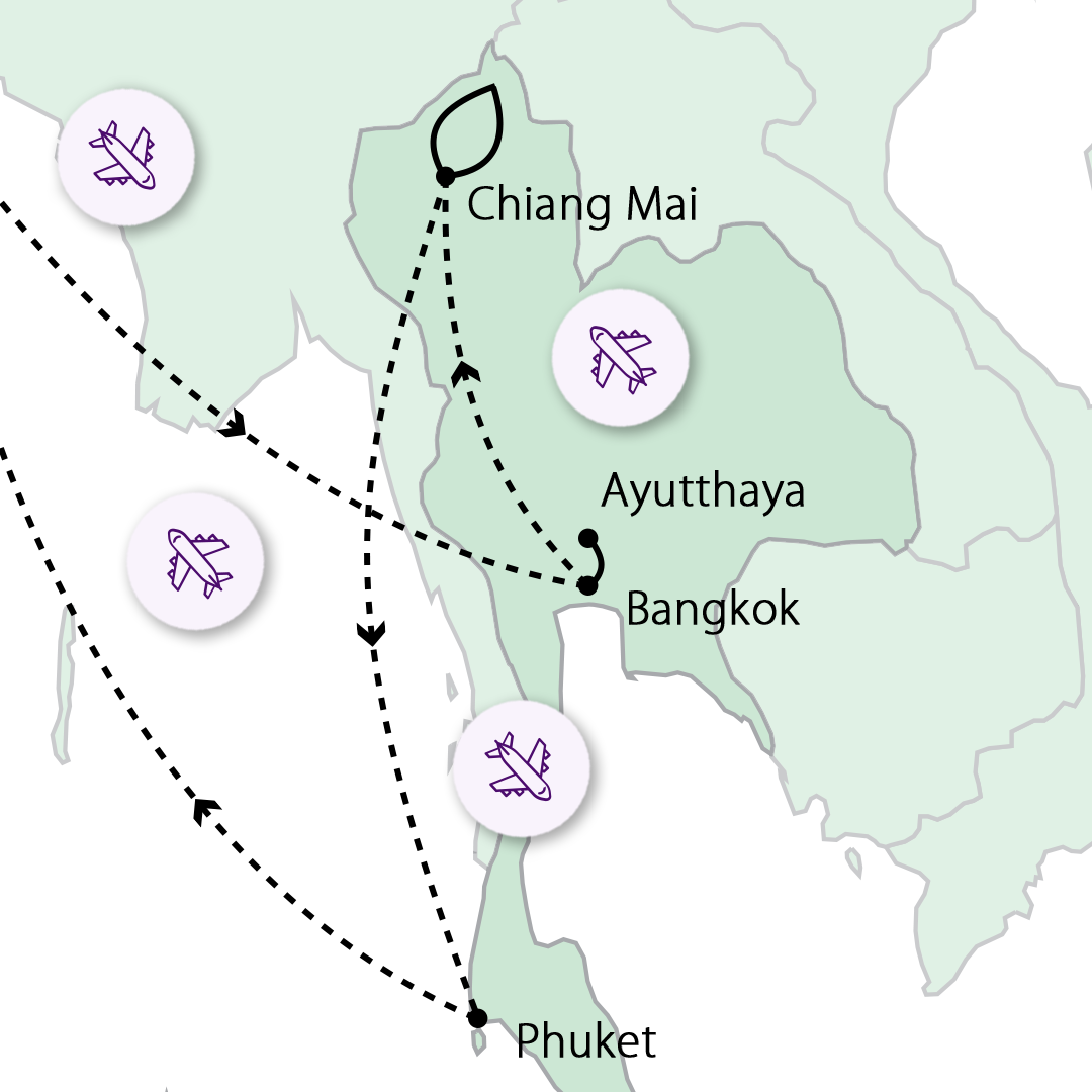 Ayutthayába, elfoglaljuk a szállásunkat, majd rövid pihenőt tartunk. Este tuk-tukos városnézésre indulunk az UNESCO Világörökségi területen. A vacsoránkat egy hangulatos folyóparti étteremben fogyasztjuk el. 5. NAP AYUTTHAYA, MAJD REPÜLÉS CHIANG MAI-BA Reggel Thaiföld egykori királyi fővárosát Ayutthayát látogatjuk meg, ahol a történelem csendje és a romtemplomok időtlen méltósága fonódik össze. Láthatunk ma is működő kolostort, a fák gyökerei között rejtőző Buddha-fejet és közel 400 éves, khmer stílusú királyi templomot. Ezt követően látogatást teszünk a Chao Sam Phraya Nemzeti Múzeumban, ahol királyi aranykincsek és templomokból származó régészeti leletek láthatók. Programunk végén transzfer a repülőtérre, elrepülünk Chiang Mai-ba. Szállás (4 éj), vacsora. 6. NAP CHIANG MAI FELFEDEZÉSE Reggeli után tuk-tukkal indulunk a Kad Luangra, mely Chiang Mai legnagyobb piaca. Friss élelmiszerek, helyi snackek, hagyományos ruhák és jellegzetes regionális termékek várják a látogatókat. Ezt követően rövid séta a közeli Kad Meo piacra. A piac főként kézműves tárgyairól és színes textíliáiról ismert. Tuk-tukkal továbbutazás a Thapae úton keresztül az Óváros falaihoz, majd látogatás a Wat Phra Singh templomnál. A templom a lanna építészet egyik legszebb példája. Láthatjuk a Viharn Lai Khan-t, Észak-Thaiföld legimpozánsabb szent könyvtárát. A látogatás után transzfer a kikötőbe, ahol megkóstolhatjuk Csang Mai híres, curry-s tésztalevesét. Napközben lesz szabadprogram is. Ebéd után kisbusszal indulás a Wat Phra That Doi Suthep templomhoz, Chiang Mai ikonikus szent helyéhez. Este szállás. 7. NAP ARANYHÁROMSZÖG TEMPLOMAI A napunk első állomása a Wat Rong Khun (Fehér Templom), mely egy modern mestermű, amelyet tükröződő mozaikok díszítenek. Ezt követően ellátogatunk Karenbe a hosszúnyakúak falujába, ahol megismerhetjük a hegyi törzs hagyományait. Ebédünket egy tipikus helyi étteremben fogyasztjuk el. Továbbutazás az Arany Háromszögbe, ahol Thaiföld, Laosz és Mianmar határa találkozik. Csónakázunk a Mekong folyón, majd megtekintjük az Ópium Múzeumot. Visszaút Chiang Maiba, útközben megálló a Wat Rong Suea Ten-nél (Kék Templom), amely lenyűgöző, kobalt-kék belső teréről ismert. Szállás, mint előző napokon. 8. NAP MAE WANG-VÖLGY, ELEFÁNT OTTHON Mai napunk egészét a Mae Wang-völgyben töltjük tartalmas programokkal. A folyón bambusz tutajjal egy vízeséshez megyünk. Ezt követően ellátogatunk egy elefánt otthonba, ahol a bátrabbak részt vehetnek az állatok etetésében és fürdetésében. Délután visszaérkezés Chiang Mai-ba. Este khantoke vacsorán veszünk részt: hagyományos északi thai étkezés tálcákon felszolgálva, Lanna kulturális táncprodukcióval kísérve. 9. NAP BÚCSÚ CHIANG MAI-TÓL, UTAZÁS PHUKETRE Reggeli a szállodában, majd transzfer a Chiang Mai repülőtérre, és elrepülünk Phuketre. Transzfer a tengerparti szállodába. A nap hátralévő részében szabadprogram és pihenés. 10. NAP PHUKET FELFEDEZÉSE A mai nap során végighaladunk a sziget festői tengerparti útjain, miközben lenyűgöző kilátás nyílik a partvonalra. Fotós megállót teszünk a Karon kilátópontnál, ahonnan Kata Noi, Kata Yai és Karon strandjai, valamint az Andamán-tenger panorámája tárul a szemünk elé. Ezt követően felfedezzük Phuket óvárosát, amely a kínai kereskedők örökségét és a színpompás szino-portugál építészetet ötvözi. Ellátogatunk a Wat Chalong-hoz, a sziget legfontosabb és legszebb kolostorához, amely szent relikviáiról és különleges atmoszférájáról ismert. A napot a híres Promthep-foknál zárjuk, ahol a sziget egyik legszebb naplementéje tárul a szemünk elé. 11-12. NAP PIHENÉS ÉS FAKULTATÍV PROGRAMOK Ezen a két napon mindenki eldöntheti, hogy pihen a szálloda tengerparti strandján vagy választ a fakultatív programjaink közül: