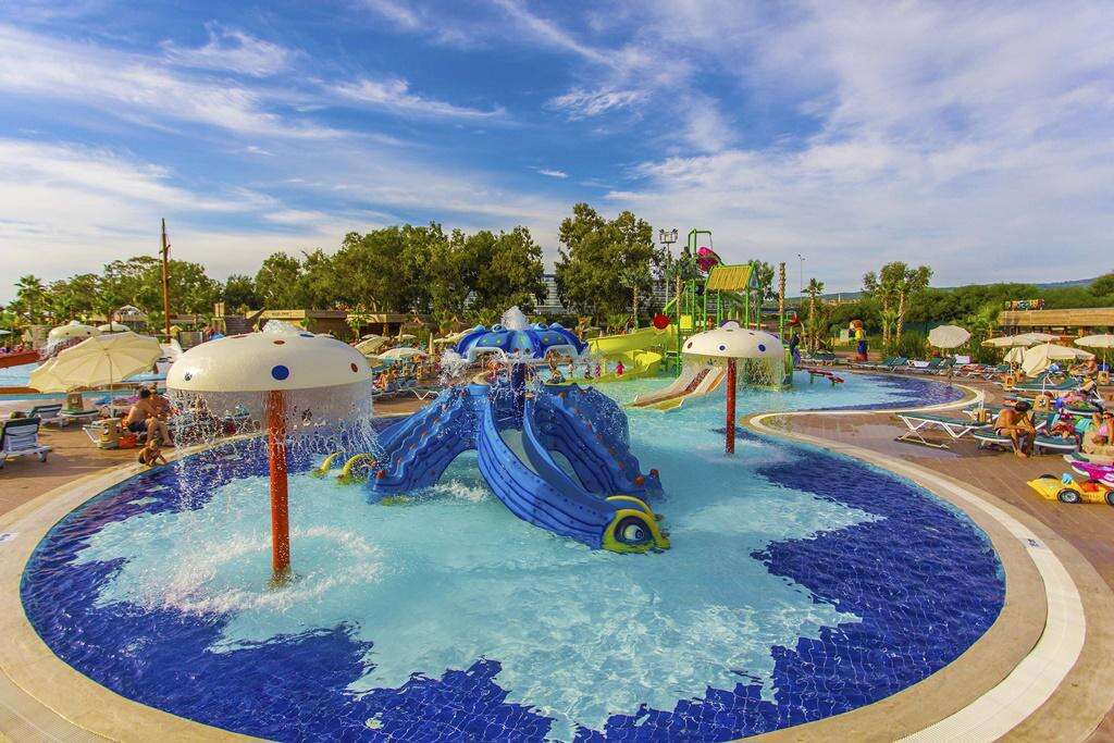 SZOLGÁLTATÁSOK: medencék napernyőkkel és napágyakkal • külön medence felnőtteknek • csúszdák • főétterem • bárok (lobby, medence, strand stb.) • cukrászda • nappali és esti animációk • élőzene • diszkó • amfiteátrum • strandröplabda • darts • aerobik • vízi torna • asztalitenisz • kosárlabda • TV-sarok • szauna • törökfürdő • térítés ellenében: spa központ • masszázs • peeling • gőzfürdő • törökfürdő-kezelések • fodrászat • üzletek • mosoda • orvosi szolgálat • pénzváltó • teniszpálya • teniszpálya világítással és felszereléssel • futballpálya és világítás • biliárd • autókölcsönzés • vízi sportok a strandon • konferenciaterem