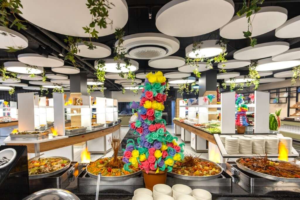 Ultra All inclsuive: Reggeli, ebéd és vacsora büférendszerben, késői reggeli, diétás ételek, gyermekmenü, napközbeni snackek, éjszakai snackek (23:00-07:00), pide, gözleme és fagylalt meghatározott időpontokban, kávé/tea és sütemények, helyi és néhány import alkoholos és alkoholmentes italok (10:00-02:00), naponta vízzel feltöltött minbár, 2 a’la carte étterem (török és hal, tartózkodás során 1 alkalommal, előzetes asztalfoglalással).
