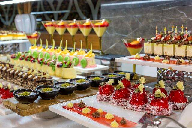 Ultra all inclusive: reggeli, kései reggeli, ebéd és vacsora büférendszerben, délutáni és éjszakai snackek (00:00-07:00 között), diétás büfé, témaestek, gyermekbüfé a főétkezéseknél, gyermekétterem, sütemények, pizza, gofri, fagylalt (bizonyos időpontokban), török specialitások a török sátorban bizonyos helyi és néhány import alkoholos és alkoholmentes italok (napi 24 órában), minibár (üdítők, víz és sör; naponta feltöltve).