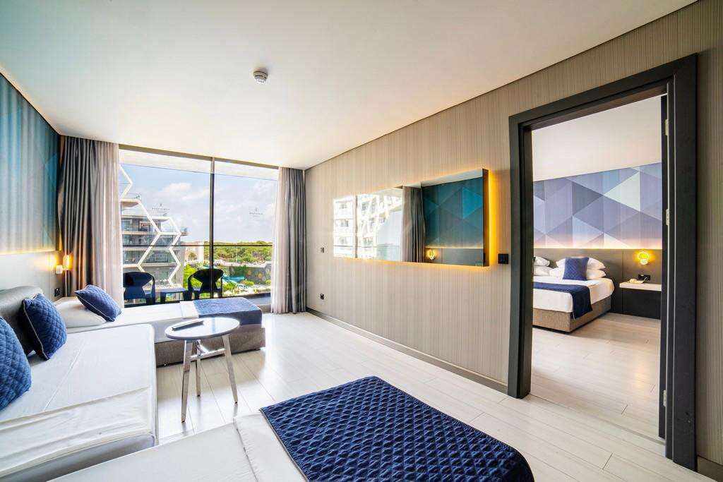 SZOBÁK: 455 szoba • erkély • légkondicionálás • hajszárító • TV • telefon • széf • minibár • vízforraló • kávé- és teakészítő • wifi • Standard szobák: 30–33 m², max. 3+1 fő • Családi szobák: 60 m², max. 4+1 fő, 2 szoba összekapcsolt ajtóval